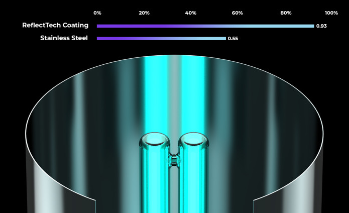 このReflectTechコーティングはUV-Cランプから照射された紫外線を反射する事で、流れる空気への紫外線の照射量を増やして除菌能力を上げるほか、微粒子が内壁に付着するのを防止する役割も持っています。