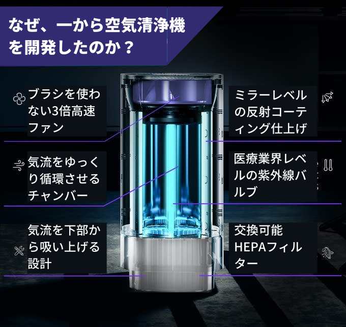 UV-Cライトの照射時間を最大化する設計になっています。照射時間が長ければ長いほど、空気の除菌効果が高くなります。時間をかけて空気を処理するために垂直型のチャンバー設計にたどり着きました。チャンバーの中には、製品の高さに対して75%の長さのUV-Cライトを内蔵しており、他社に比類のない構成になっています。