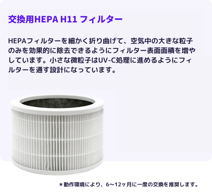 室内全体の空気を、次のUV処理がより効果的になるように、H11フィルタークラスのHEPAフィルターで大きな粒子を除去!