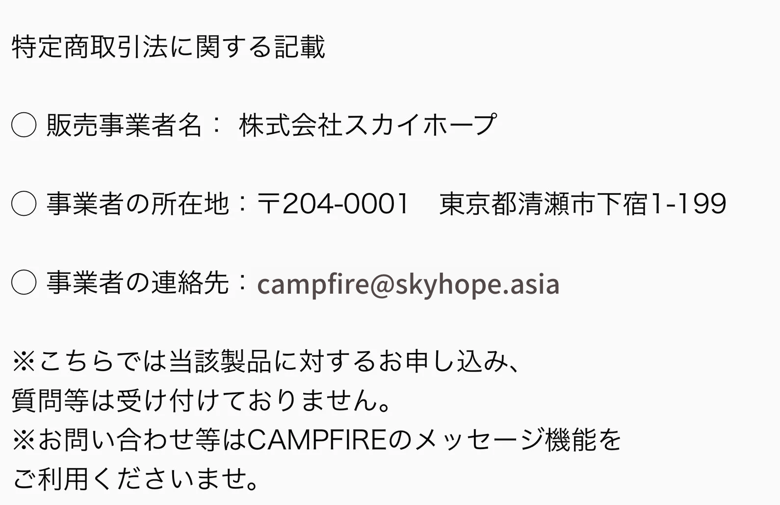 ※本文中に記載させていただいたスケジュールは、あくまでプロジェクト公開時点の予定です。応援購入の性質上、配送遅延のおそれがございます。 ※原則として、配送遅延に伴う応援購入のキャンセルはできませんが、リターン配送予定月から6ヶ月を超えた場合には、希望者に限りキャンセルにて対応させていただきます。 応援購入サービスの性質上、以上の注意点につきましてあらかじめご理解とご了承いただいた上でご支援くださいますよう、よろしくお願い申し上げます。