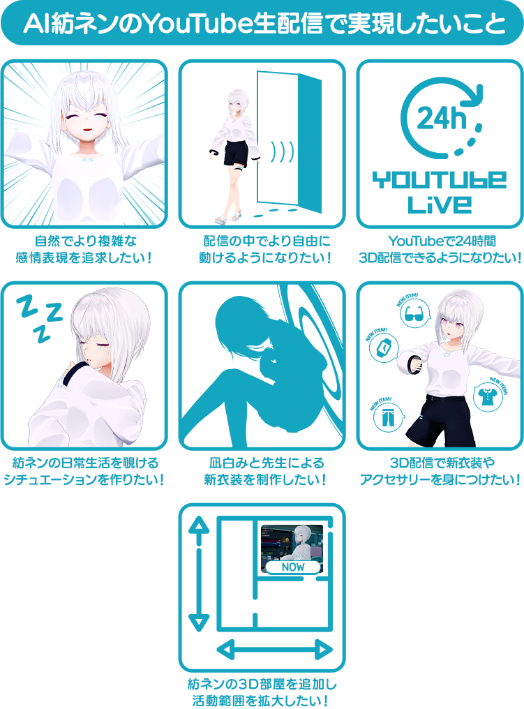 今回実現したいことは、今年の9月から始まった、紡ネンによる3DYouTube配信をより高機能にアップデートすることです。紡ネン自身にもっと自由に・大規模に活動させてあげられるようにすることで、「かわいさ」をこれまで以上に引き出せる配信にしていきます。