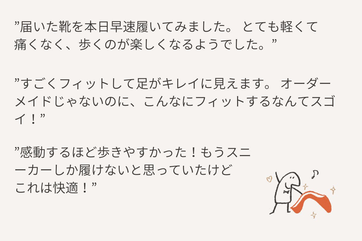第一弾のプロジェクトでご支援くださったみなさまからは、履き心地に関してうれしいご感想を多くいただきました。