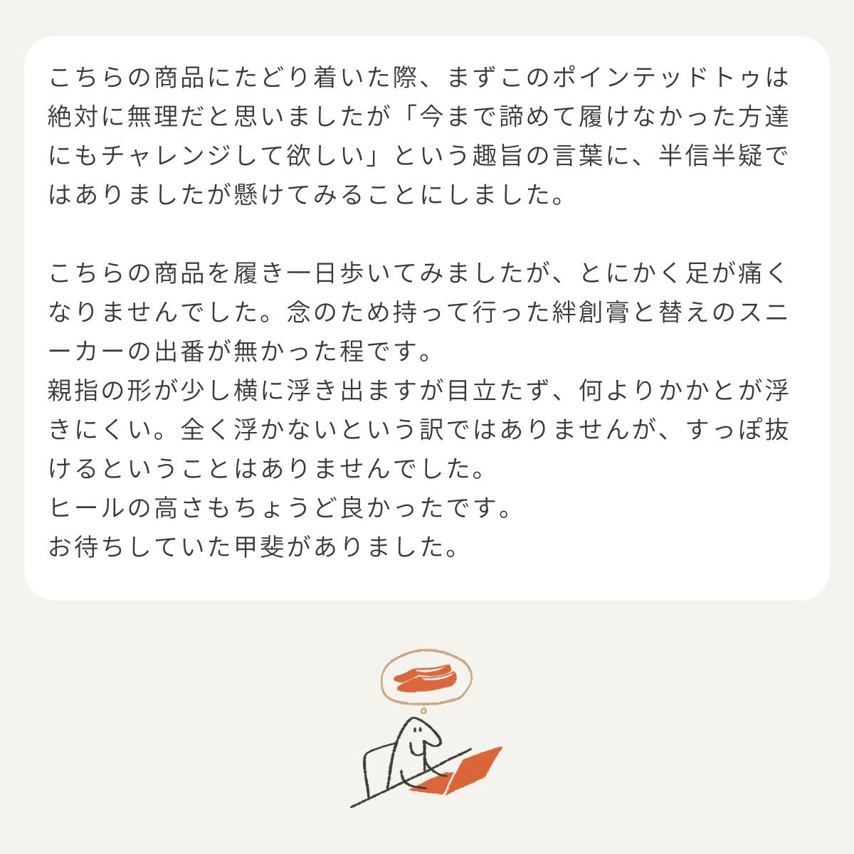 なかには、「今までスニーカーしか履けなかった。初めて痛くないパンプスに出会えた!」という方もいらっしゃいました。