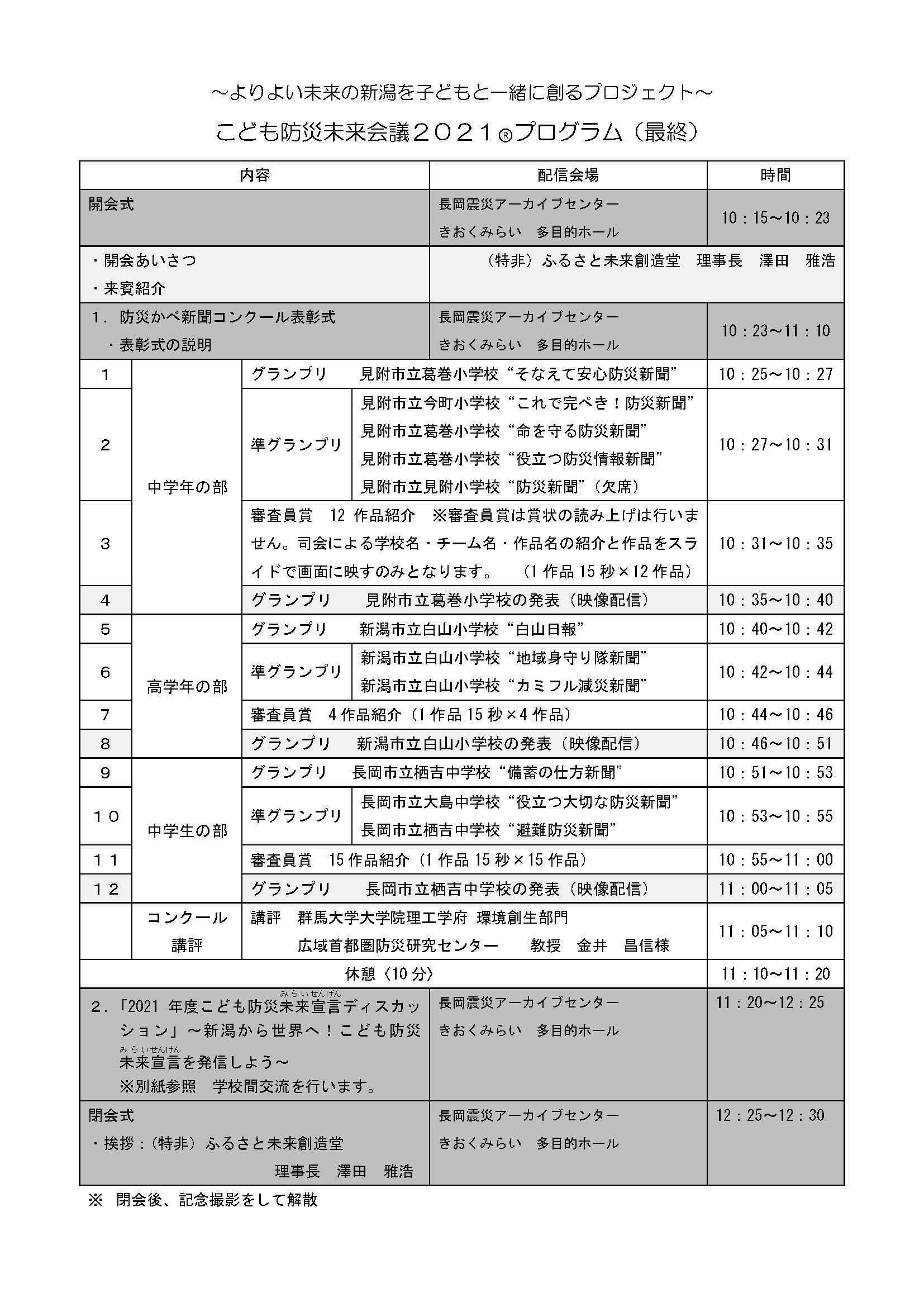 2021/12/08 12:42みなさんこんにちは。ふるさと未来創造堂の中野明子です。あっという間に、こども防災未来会議まであと4日となりました。会場参加者46名、オンライン参加者28名での開催になります。表彰式での子どもたちは、自信と緊張の間で、とてもキラキラしています。そして、表彰後に賞状を掲げた時の笑顔は格別!!未来宣言ディスカッションでは、緊張からワクワクへ変わっていき、オンライン参加者も画面上に体を乗り出している様子が見られます。学びを生かし、新たに吸収しようとするたくましい姿が、見ている大人に響きます。こどもから発信する防災、新潟の未来を考えるディスカッションに向け、最終準備を進めてまいります。引き続きどうぞ応援の程よろしくお願いいたします。 もっと見る
