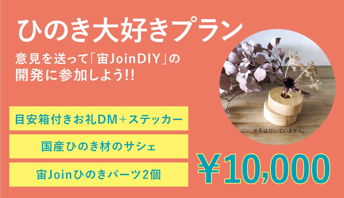 宙JoinDIYへのご意見を投稿できるQRコード付きの応援お礼DMを送付します。宙JoinDIYひのきパーツは非売品です。CAMPFIRE限定出品です。ひのきサシェは宙JoinDIYの製造過程で出たひのき端材で作られています。送料・税込の価格となります。