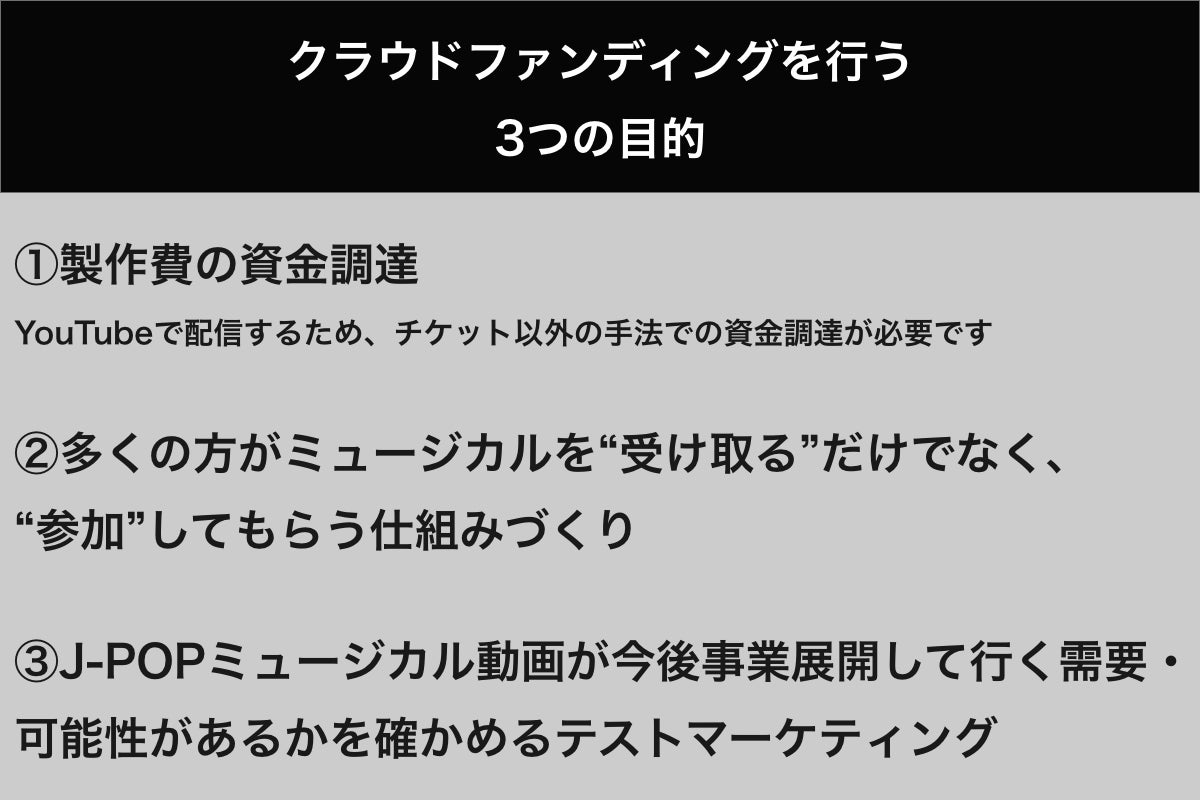 今回のプロジェクトでは、J-POPミュージカルというジャンルを確立することで、今後も気軽にミュージカルに触れられる場を作っていきたいと考えています。その第一弾として、ミュージカル業界の今後を担うであろうキャスト・スタッフとJ-POPミュージカル動画『Tokyo Jukebox Musicals』(計4話のドラマ仕立て)を制作しました。これをYouTubeで無料配信するためには、製作費の資金調達が必要です。会場費・キャストスタッフへのギャラ・音響美術など、ミュージカルには様々な製作費がかかっています。今後このジャンルを広げていくためにも、皆さんに本プロジェクトの1歩目の背中を押して頂きたいです。