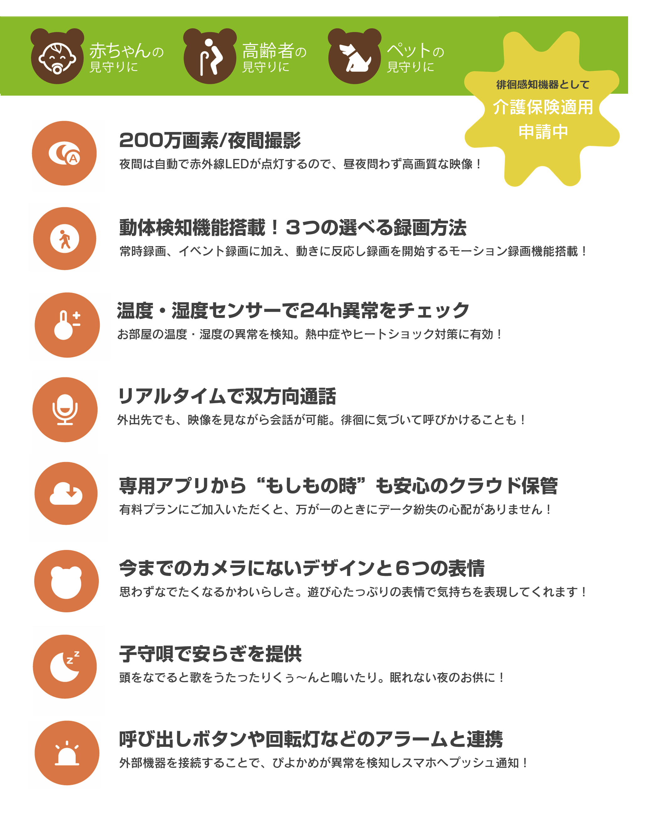 録音&録画、双方向通話、温度・湿度の管理、スマホへのプッシュ通知など機能が盛りだくさん。