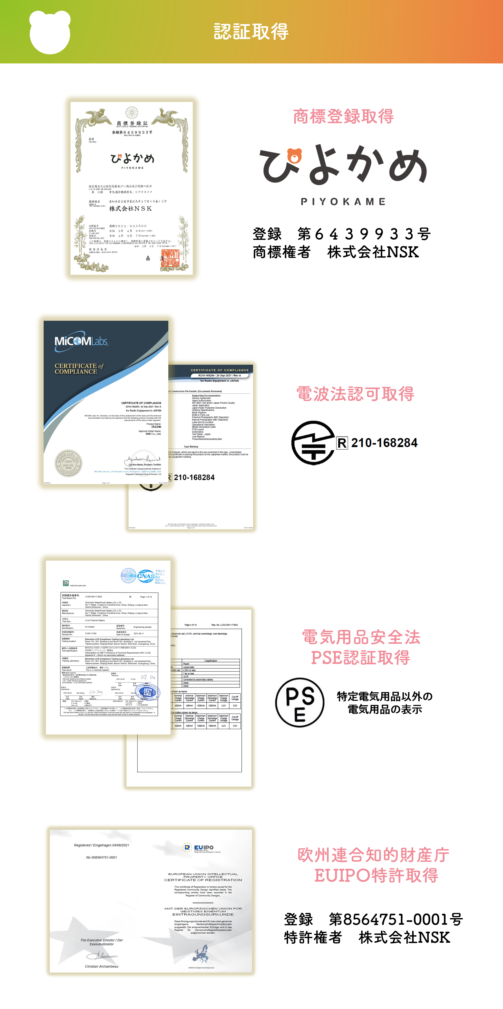 ぴよかめは電波法に基づく「技術基準適合証明」を取得しています。