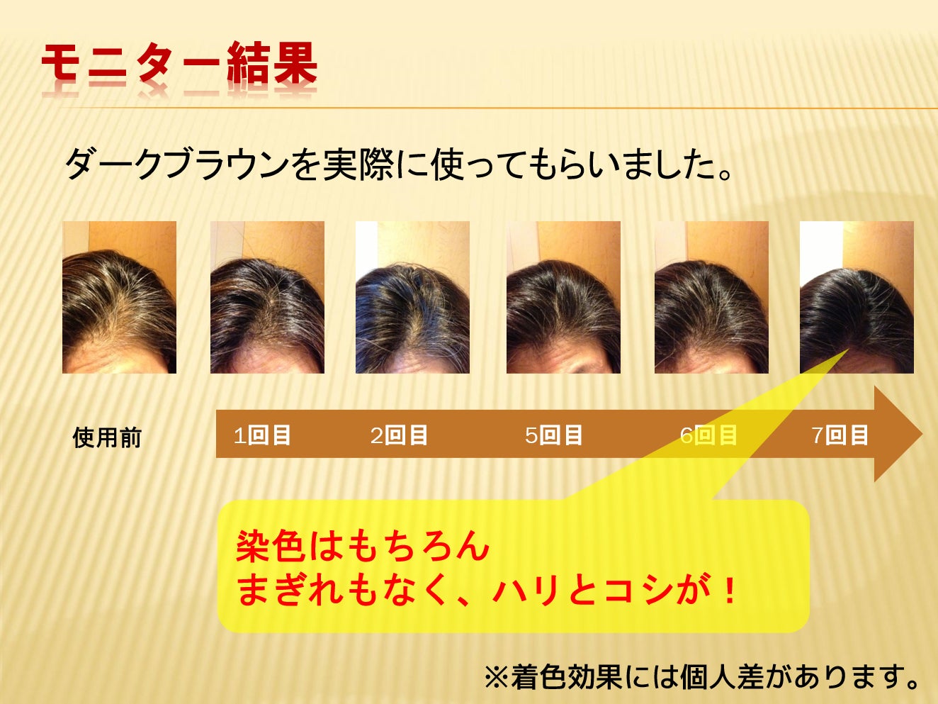 市販のカラー剤のように1回では染まりにくいものの、やさしさと手軽さ、自然な染め上がりが魅力です。