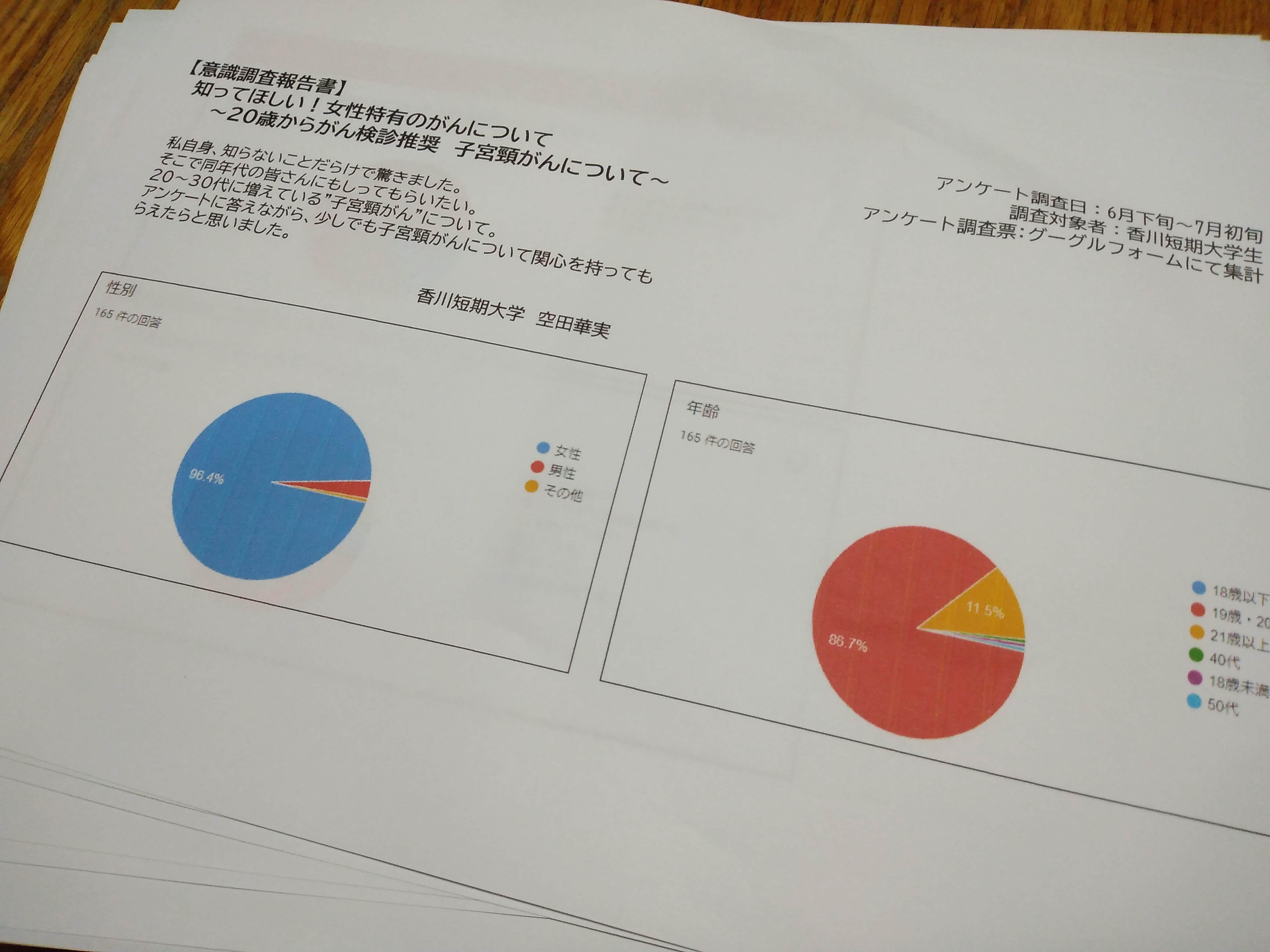 今年7月、香川短期大学の学生165人に対して意識調査を行いました。その中で検診に対して不安を抱えている人が多い事を知り、まずは自分が体験しその大切さを伝えようと思い、子宮がん検診を受けて先生に母の事も伝えました。