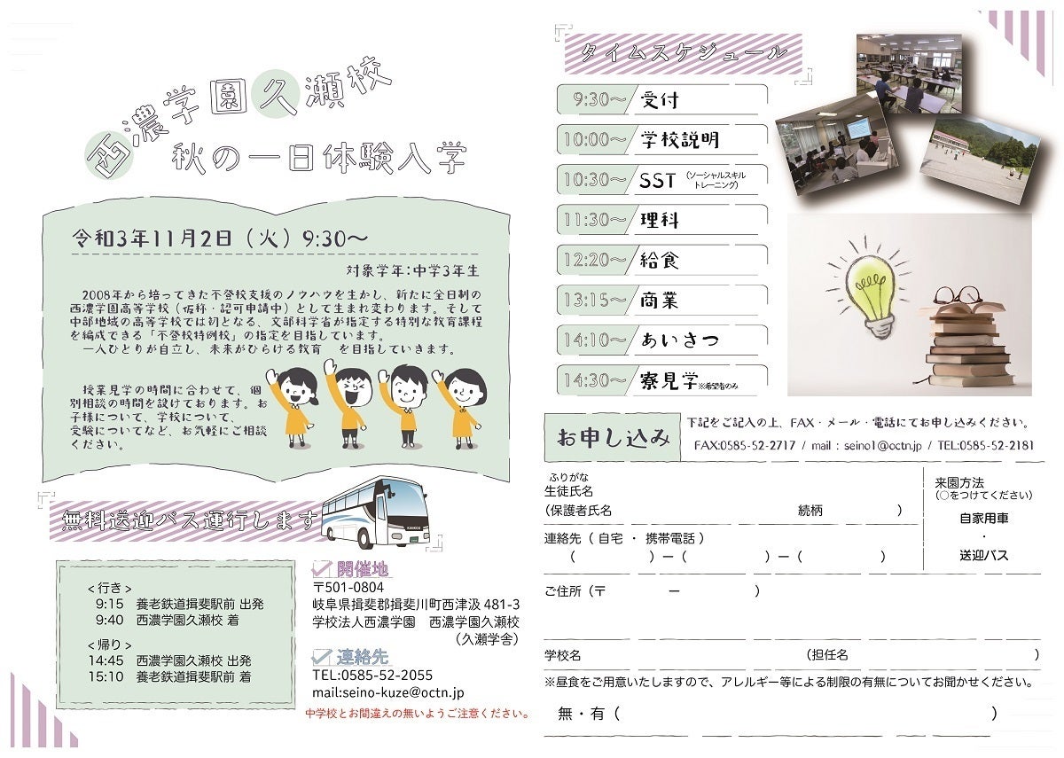 令和3年11月2日(火)に西濃学園久瀬校の一日体験入学を予定しています。申し込み期限はなく、当日でもOK。子どものこと、学校のこと、受験のことなど、お気軽にご相談ください。