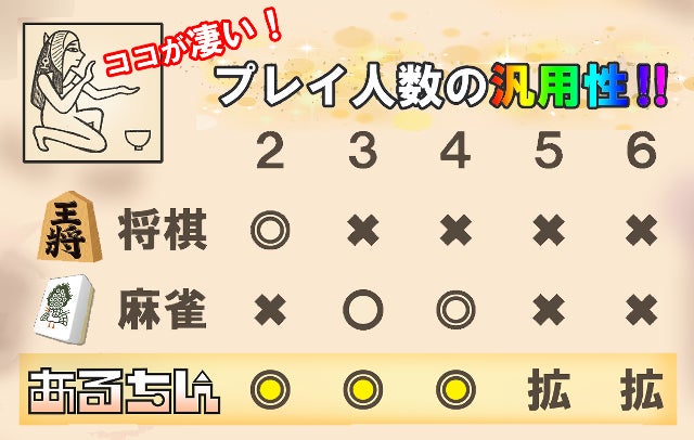 あるちんはあらゆるボードゲームの中でも人数の汎用性が非常に高いゲームとなっています。将棋は2人でしかできず、麻雀は3人ないし4人揃わないとプレイできず5人だと1人余ってしまいます。あるちんは2人でも4人でも、そしてスコアボードとチップを追加(拡張)するだけで最大10人までプレイすることができます。