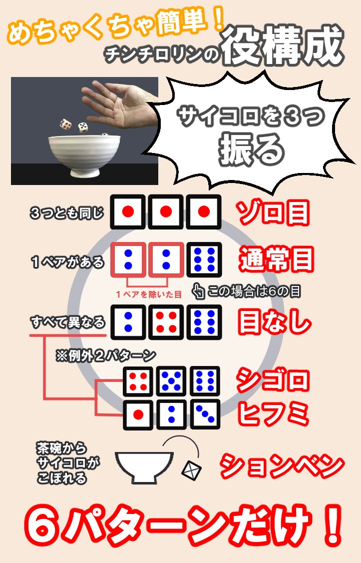 サイコロを3つ振れば1秒で役が決まります!覚えるパターンは6パターンしかありません!誰でも簡単に覚えることができます。子が親に挑む形でチップをBETし、役の勝敗で相手のチップを奪い合うゲームです。2人対戦では減算式を推奨しており相手の持ち点が0になったらゲームセットです。