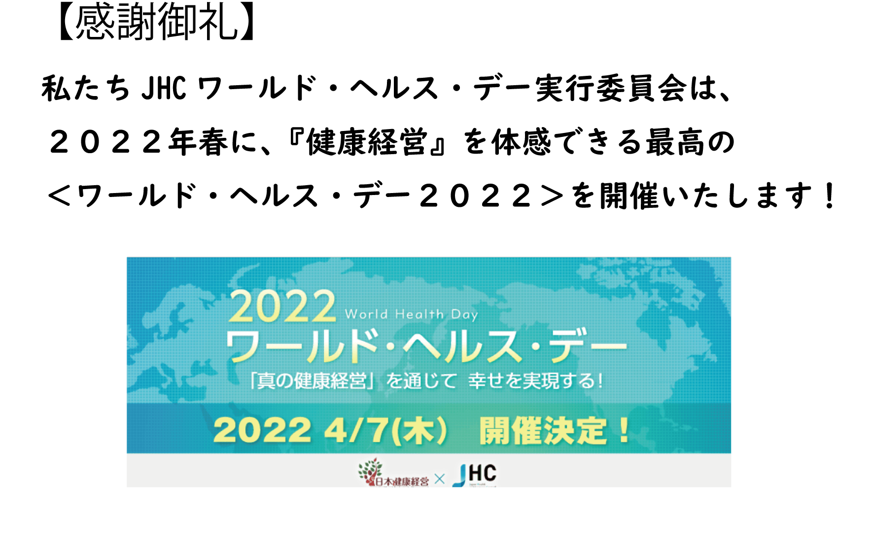 2021/11/29 22:24『真の健康経営』 を世界に伝えるために、ワールドヘルスデー2022を開催します!本日、クラウドファンディングの最終日を迎え、ここまでご支援をいただいた皆さまへ、あらためて感謝の気持ちをお伝えさせていただくとともに、今回いただいた気持ちのこもったご支援を大切に活用させていただき、2022年春に開催するイベントを成功させることをお約束させていただきます!【JHCワールド・ヘルス・デー2022概要(2021.11.29現在) 】2021年から始まったJHCワールド・ヘルス・デーは、来年2022年に二度目の開催を企画し、打ち合わせが繰り返され、着々と準備が進められています。開催概要は現時点で以下の通りとなりますので、当日はオンラインでの視聴とはなりますがスケジュールの確保をお願いいたします。◇日程:2022年4月7日(木)9:30~16:00(予定)◇ 開催方法:オンラインでの配信◇ 主催:JHCワールド・ヘルス・デー実行委員会◇ 共催: (株)日本健康経営 ・ (一社)日本健康経営ビジネス協議会◇ イベント内容: ●『基調講演&パネルディスカッション』 〖(仮題)健康進化~人生100年粋活き輝ける未来の企業とは〗 ~ただいま『真の健康経営』 を伝えるための充実した講師陣をお招きできるよう準備中~ ● 健康増進活動発表会『健康経営甲子園』 健康増進、健康経営そして健康投資に取り組む企業・団体にスポットライトを当てます。「人々をとにかく元気にしたい!」「地域を元気にしたい!」 そのような思いを持って、私達は、 2022年4月7日「健康経営甲子園2022」を開催致します。<参加のメリット!>・御社の「すごい!」を全国に発信します 。・独自の健康増進・健康経営の取り組みを全国へご紹介します。・担当者の継続的な取り組みについてスポットライトを当てます。・他社の事例やハッピー、ヘルシー事例がもらえます。・SGDsの項目にも該当しアピールポイントになります 。・WEBサイト、YouTube、ラジオ、雑誌、TVなどのメディア媒体に 掲載されるチャンスがあります。 ▶健康経営甲子園・初開催!チラシはこちらから● 企業内健康増進提案『オンライン展示会』 課題解決や状況改善に向けた企業や団体内での活動について、お役に立つ情報や商品・サービスをご紹介するオンライン展示会です。☆女性の健康保持増進☆食育☆運動の定着化などのテーマでのZoomのブレイクアウトルームを活用した展示会(予定) となります。メインのポスターやWEB上での発信はこれからになりますが、随時JHCワールド・ヘルス・デーのオフィシャルHPおよびFacebookページにて情報を発信していきますのでぜひお楽しみに♪最後に私たちJHCワールド・ヘルス・デー実行委員会は、全国のファームメンバーとともに日本に『真の健康経営』を広めるとともに、日本式の健康経営モデルを完成させ、世界に健康経営の輪を広めてまいります。そのためにも、毎年開催するJHCワールド・ヘルス・デーのイベントに引き続き皆さまのご支援・ご協力をよろしくお願い申し上げるとともに、各地方の『健康経営』 の盛り上がりが全国に燎原の火となり、ニッポン全体が元気になるよう全力で向き合っていきますので、これからもどうぞよろしくお願い申し上げます!JHCワールド・ヘルス・デー実行委員会一同 もっと見る