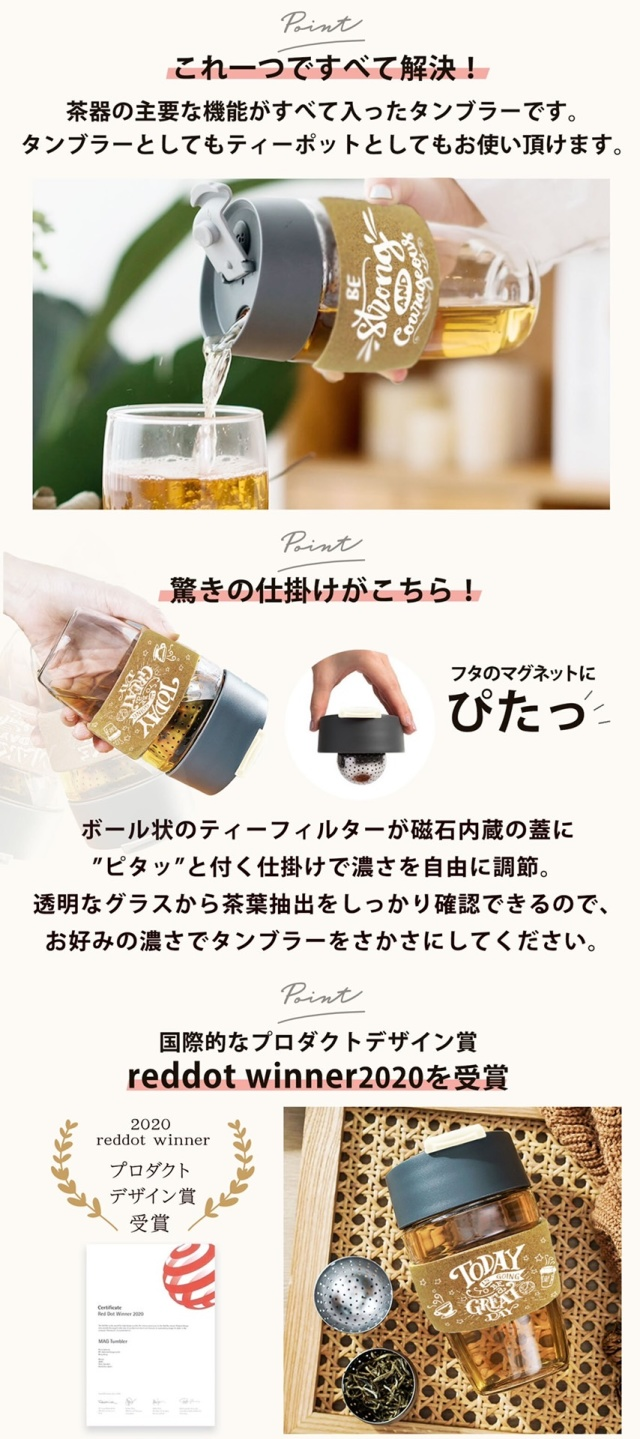 お湯でも水出しでも手軽に茶葉からお茶を楽しむコンセプトの【MAG TUMBLER 2.0】 で毎日のティーライフを更に楽しむお手伝いが出来れば何よりです。