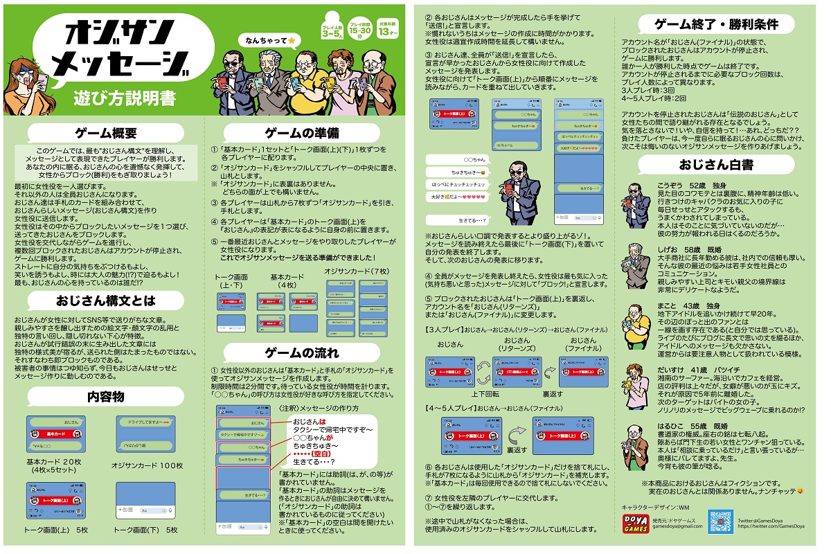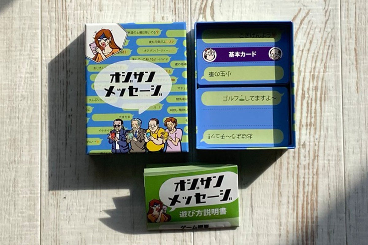 ボードゲーム『オジサンメッセージ』本体2個と特典として今回独自に調査したオジサンアンケートを封入いたします。アンケートの中身は見てのお楽しみです。