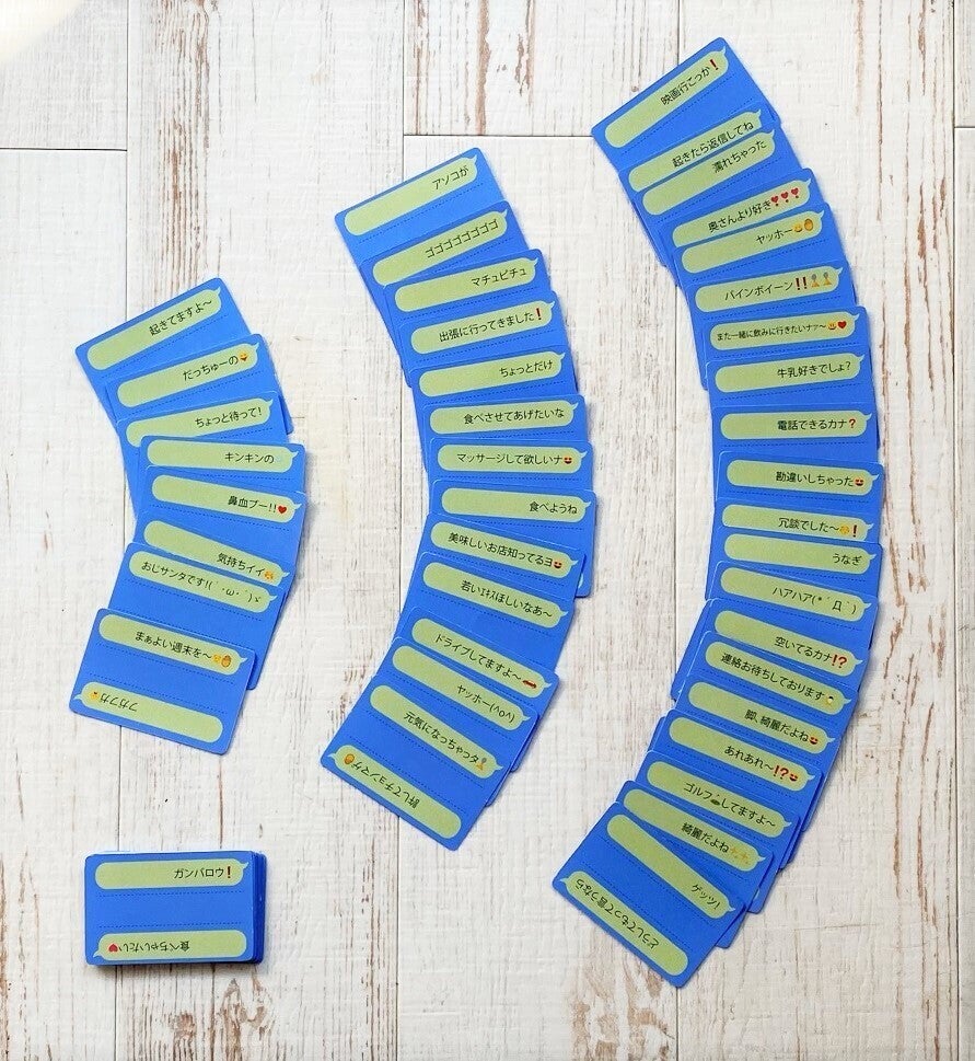 「オジサンカード」は全部で100枚(ワード400種類)入っており、基本カードを含めて作れる『オジサンメッセージ』の組み合わせは、なななんと169京7263兆4188億3926万8500通り以上となっています!?(Yahoo知恵袋調べのため計算は間違っている可能性がございます。ご了承ください)