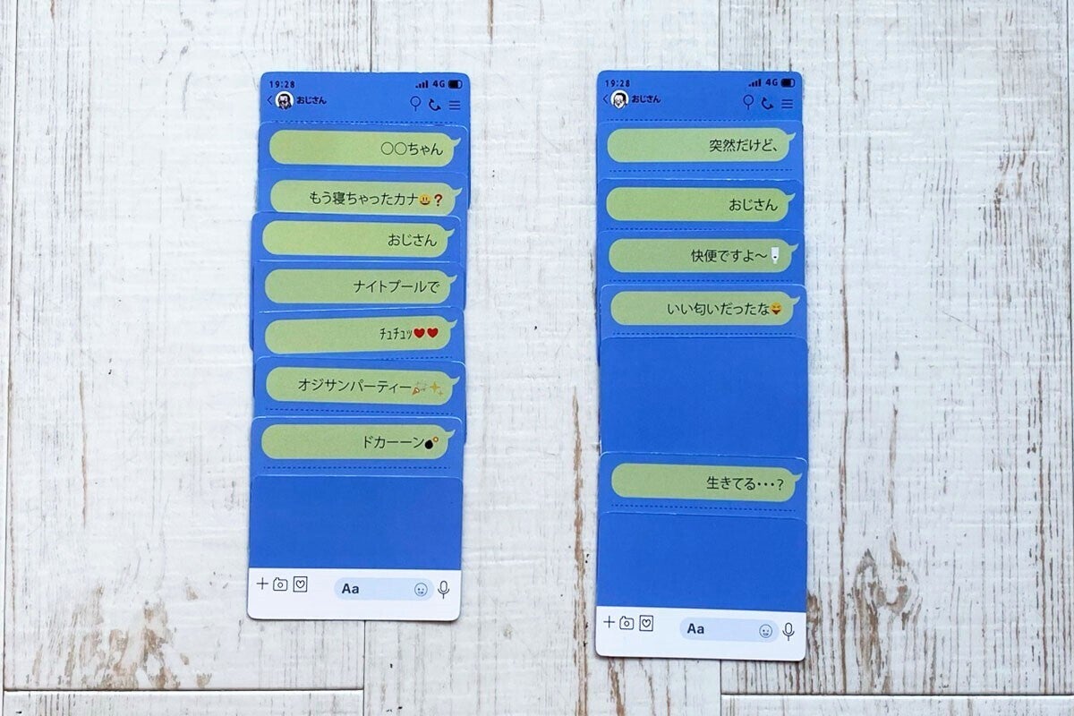 『オジサンメッセージ』の一番の魅力は「おじさん構文を使って自分だけのメッセージを作れるところ」です。 「おはよう~チュッ!」「ナンチャッテ★」など今話題の「おじさん構文」を駆使して、自由にカードを組み合わせることで、あなただけの『オジサンメッセージ』を作り出すことができます。