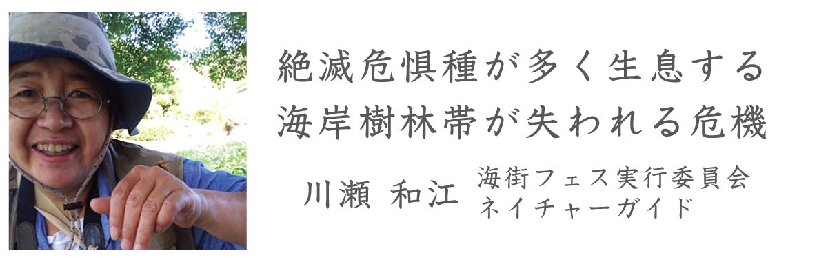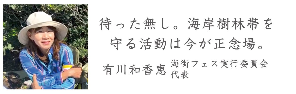 2021/11/22 17:15令和3年10月24日に第3回海街フェスを開催いたしました。当日は1,000人に及ぶ多くの皆様においでいただき、事故もなく無事に終了することができました。ご来場の皆様はじめ、事前のチラシ掲載や配布を通じて意識の拡散にご協力下さった皆様、キャンプファイヤーを通じてフェスの運営を応援して下さった方々に深く感謝致します。海街フェスの目的はなんですか?と聞かれると、私達はこう答えます。フェスを開催するのは、様々な世代の人に海岸樹林帯の中を歩いてもらうことで、この森が災害の被害を小さくすることや、多様な動植物が暮らす豊かな森であることを、より多くの人に感じでもらうことができるからです。現場に来て五感を使って観察してもらうと、大切なものが見えてきます。すぐ近くの国道を走る車の騒音をも消してしまう森の中にいると、このモリモリと成長した木々の枝葉が強風や津波の侵入を阻むことに気づきます。40年前、湘南は小さな松しか生えていない海岸でした。沿岸に暮らす人々は風、砂、塩の害に苦しめられていました。そこで神奈川県は3万人で30万本の木を植えるフェスティバルを開催し、「1本切ったら2本植える」を合言葉に海岸林を植え育ててきました。そのおかげで後の世代の私達は、海岸林の恩恵を受けて暮らしています。今年の4月に沿岸住民が行なった塩害風害調査で、海岸林が風や塩を弱めていることが実証されました。気候変動により自然災害が頻発するこの時代に、開発のために海岸林を破壊するようなことがあってはなりません。一方、津波により海岸林を失った岩手県、宮城県、千葉県は熱心に海岸林を再生しようとしています。海岸林が確かに津波を弱めたことを身をもって知っているからです。海岸林は先人が先見の明を持って育ててくれた財産です。私達にできることは、この樹林帯を後の世代にしっかり残してあげることだと思います。海街フェス実行委員会代表 有川和香恵 もっと見る