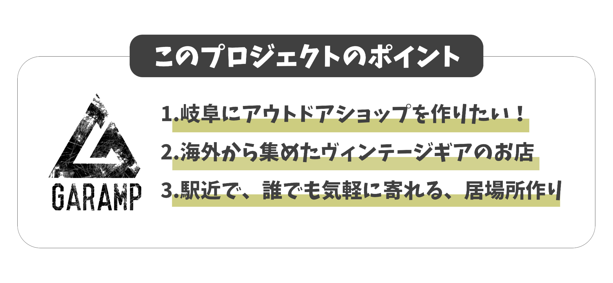 岐阜県の名鉄岐阜駅前に「ヴィンテージアウトドアショップ」をオープンするための資金をご支援いただきたいと思っております。
