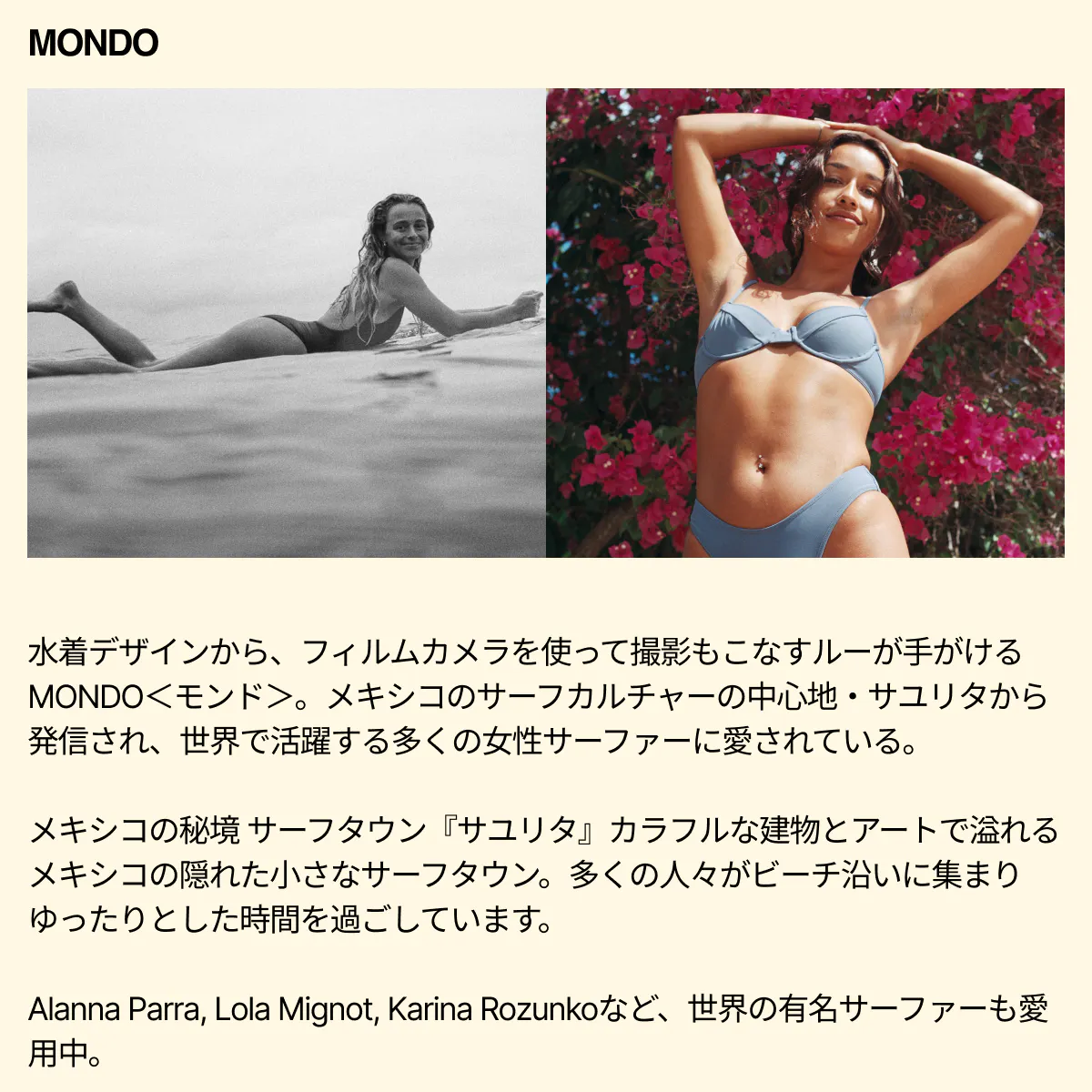 水着デザインから、フィルムカメラを使って撮影もこなすルーが手がけるMONDO。世界で活躍する多くの女性サーファーに愛され、メキシコのサーフカルチャーの中心地・サユリタから発信しています。