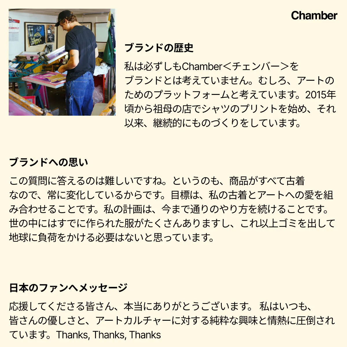 スケートボード・ロングボード・ショートボード・アートワークと多才なジェシーが手がけるカリフォルニア発のChamber。ニューポートビーチの彼の作業場で、彼のセンスによって集められたボディーにオリジナルの刺繍やスクリーンプリントが施されます。世界でたったひとつ、あなただけのアイテムを展開しています。