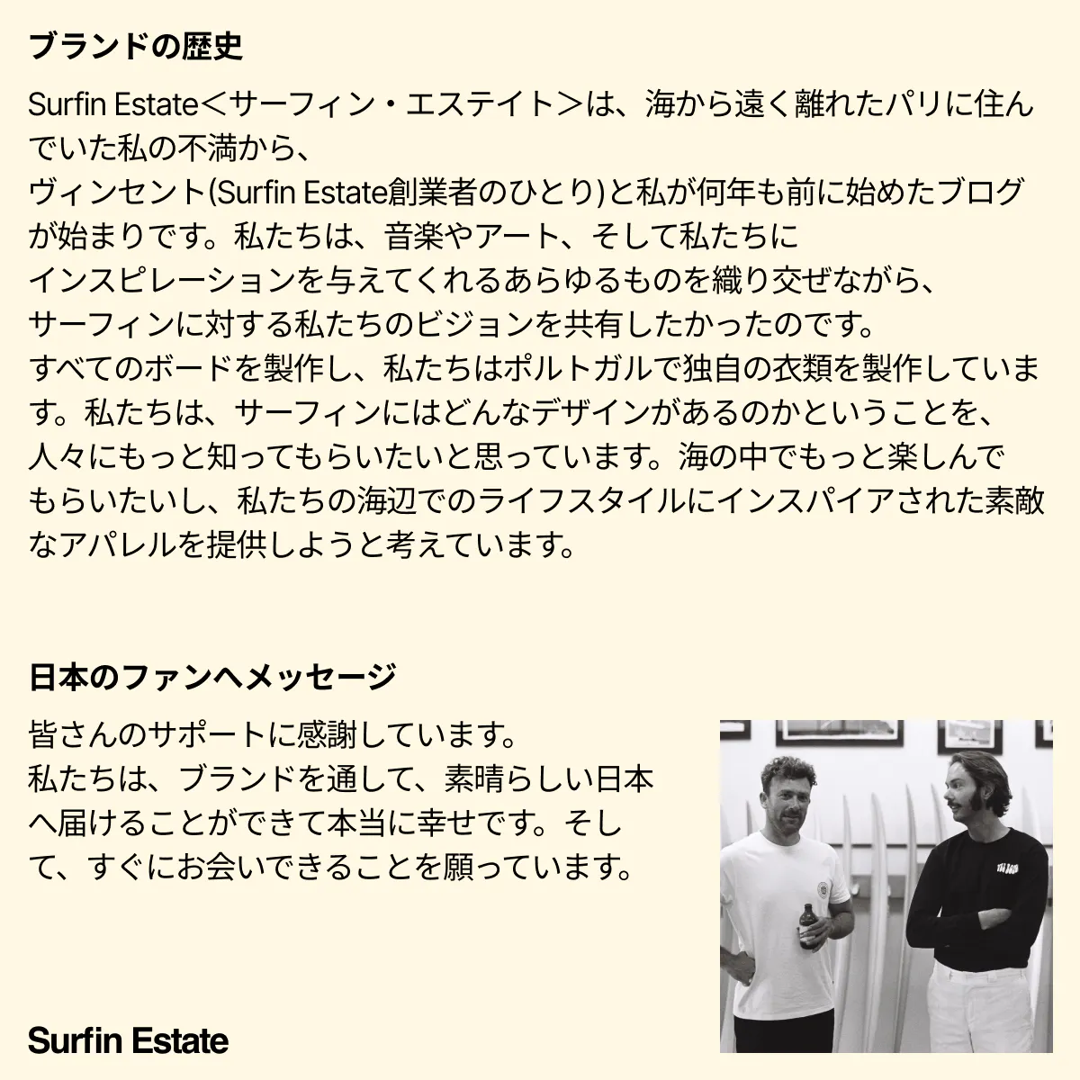 2011年にヴィンセント・ルマンソーとアーサー・ネリによって設立されたSurfin Estate。当初はウェブジャーナルでしたが、2015年にヨーロッパのサーフィンの中心地であるホセゴーにブティック/ギャラリー/ショールームをオープンし、ブランドとして確立しました。