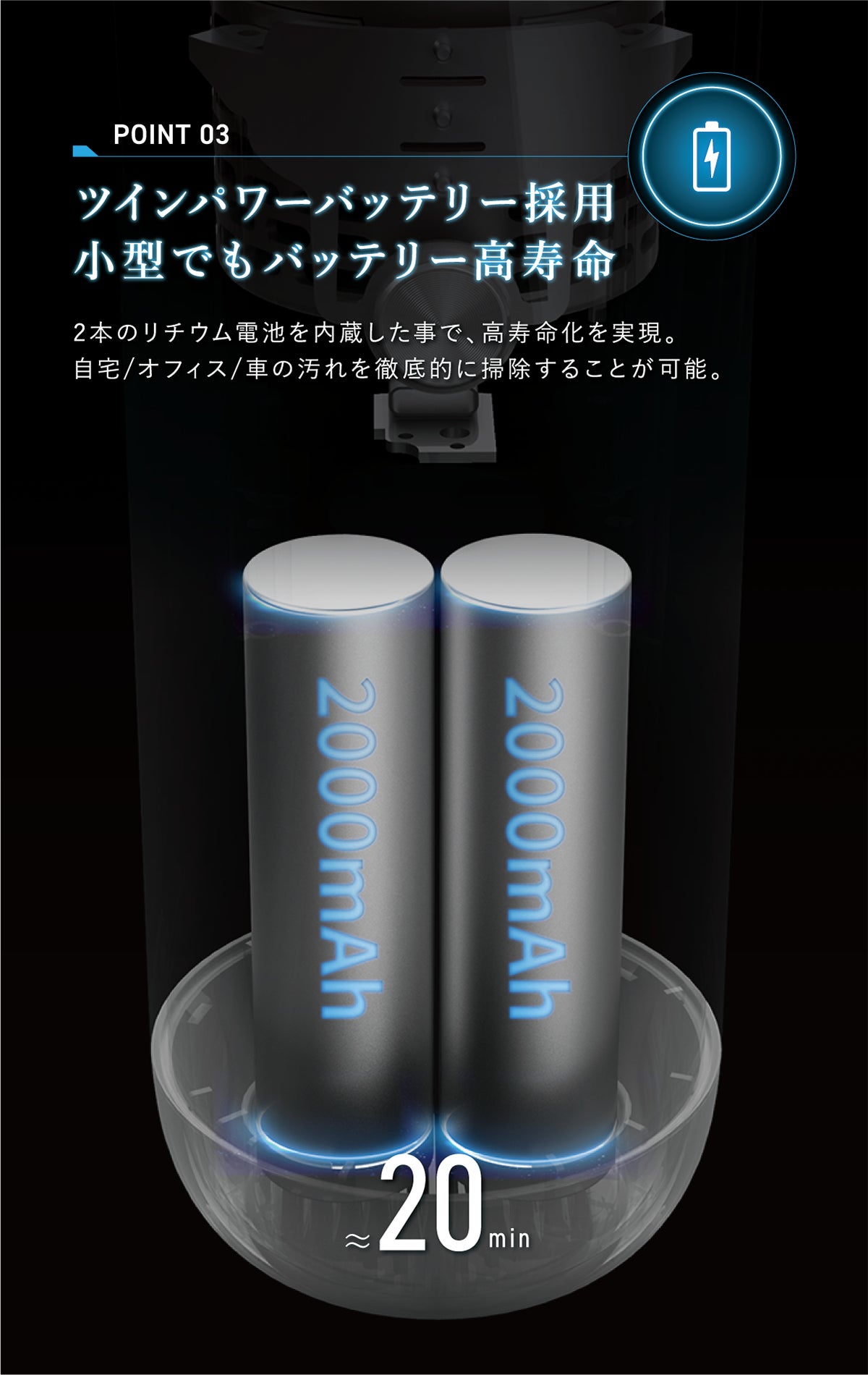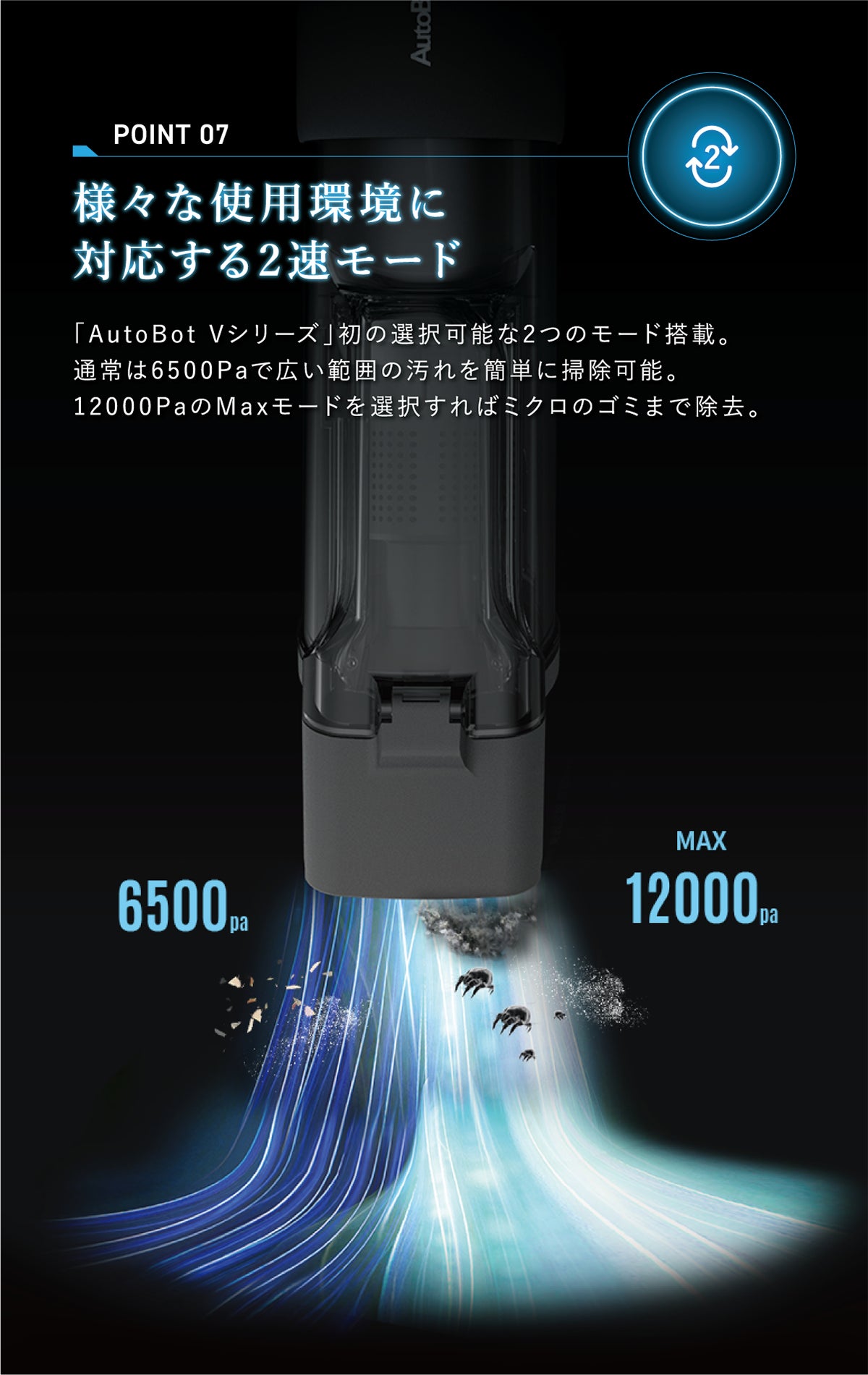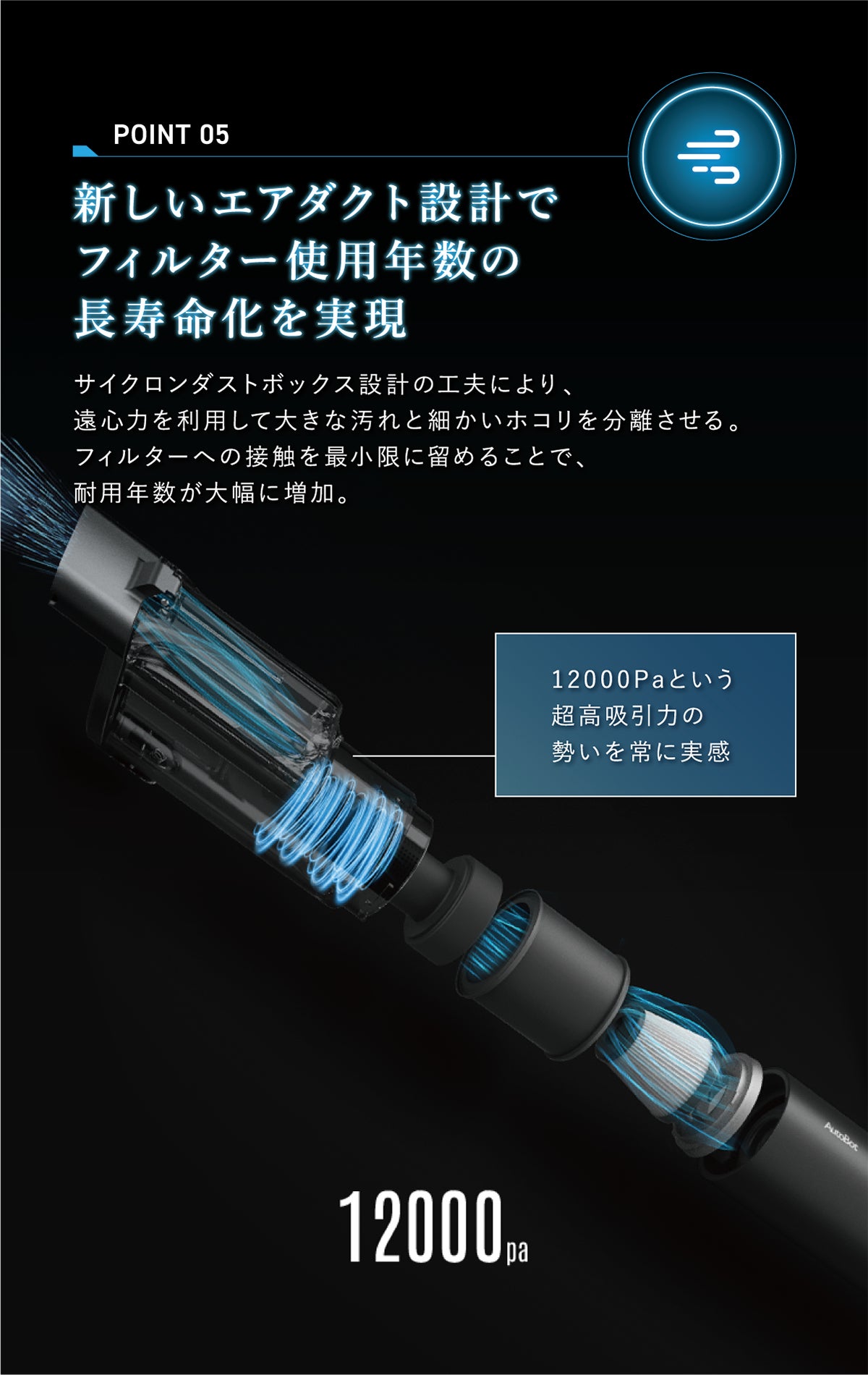 吸引力のハイパワーは、自社の大型モデルにもひけを取らない12000Paで、あらゆるごみや汚れを確実に吸引。車内の掃除時間を格段に短縮させます。