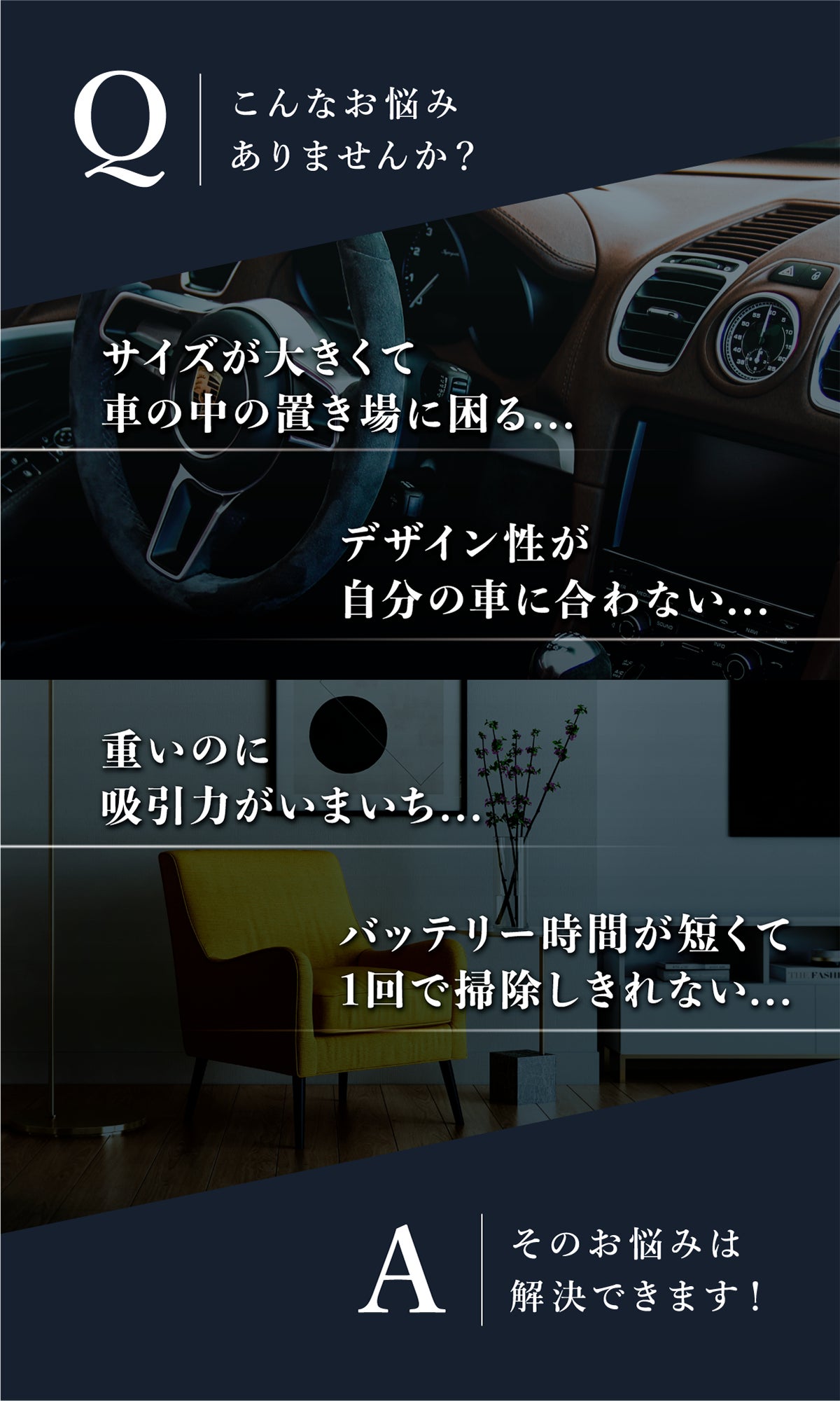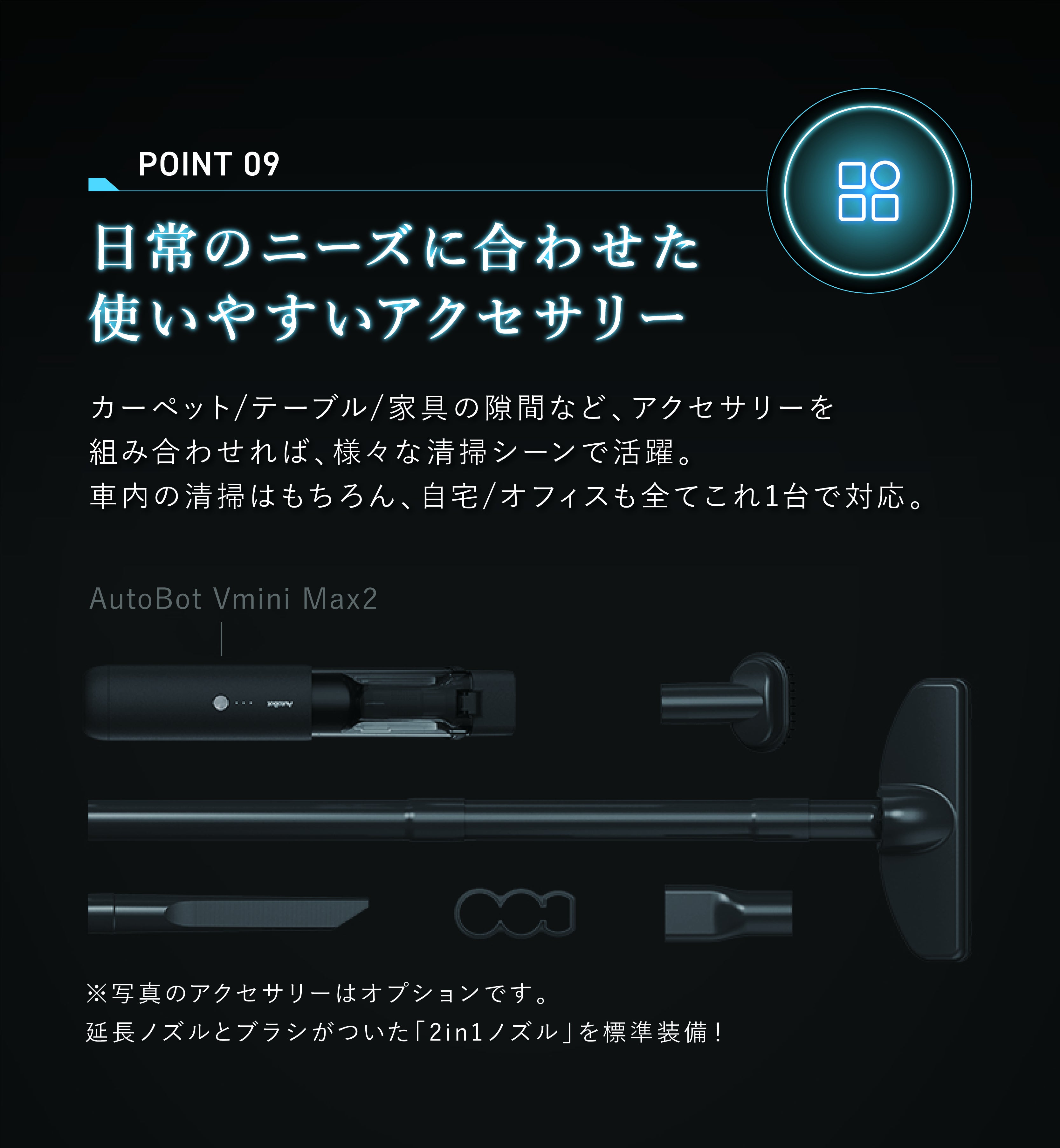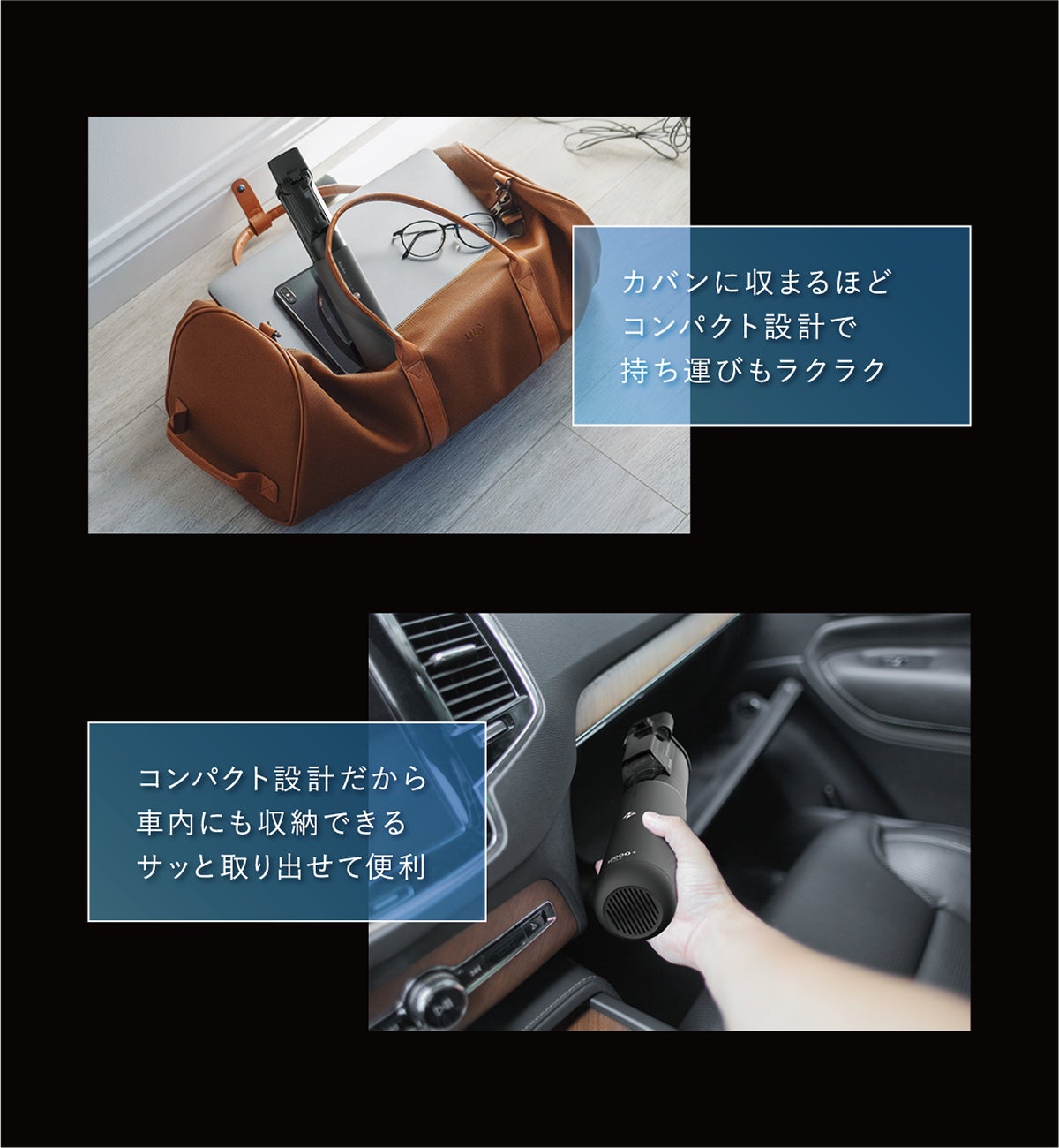 吸引力のハイパワーは、自社の大型モデルにもひけを取らない12000Paで、あらゆるごみや汚れを確実に吸引。車内の掃除時間を格段に短縮させます。