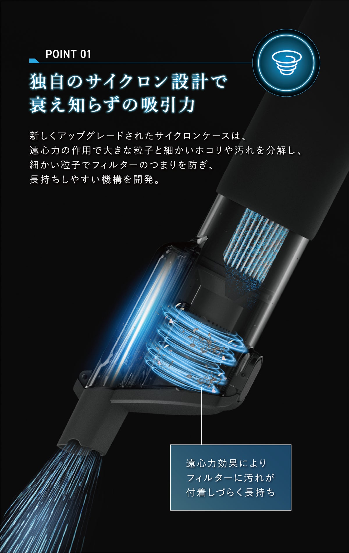 V mini MAX2は、自社の従来機種と比べてダストカップの容積を50%アップしました。ノズルの位置をケーズの外側にして、吸引力の持続性を高めています。