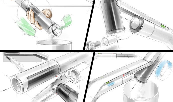 従来型のスティック式ハンディクリーナーでは、ダストカップに吸入口があるので、容積が小さくサイクロンの動作も不十分で、ゴミがすぐいっぱいになります。