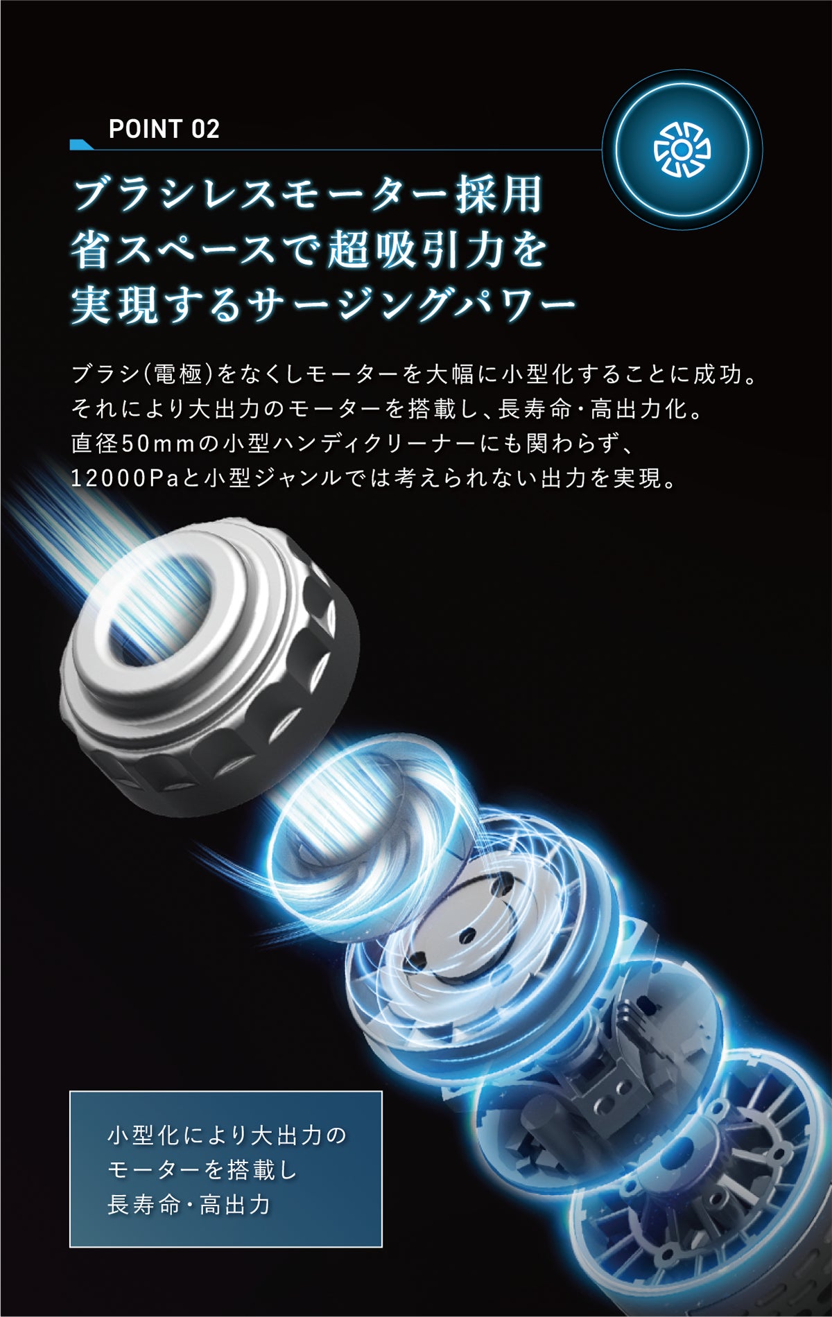 吸引力は中型、大型サイズにひけを取らない12000Pa。
