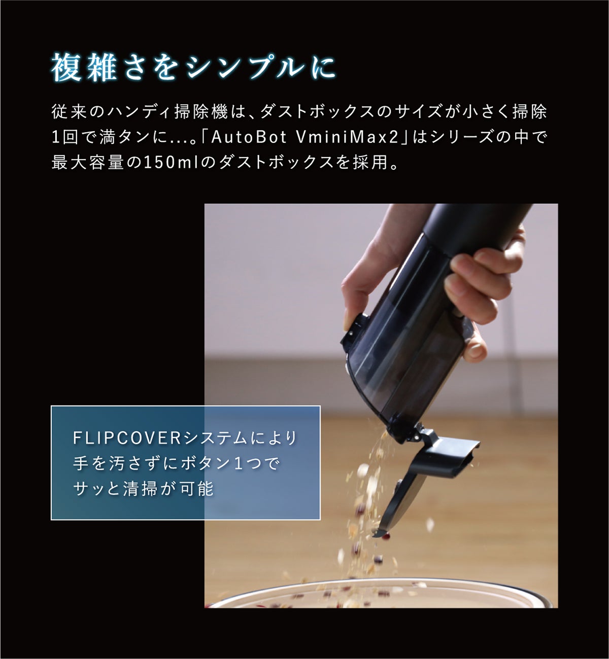 ゴミの排出は、フリップカバーのボタンをワンプッシュで、手を汚さずに排出し清掃を続けることが可能です。