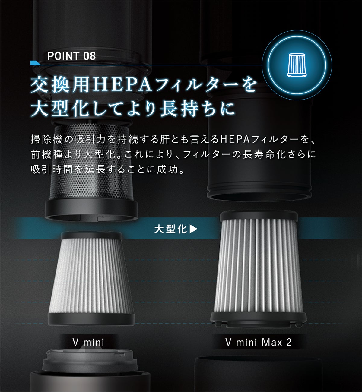 使用頻度の高い方は、必要に応じて交換用の「V mini MAX2専用HEPAフィルター」をご利用下さい。