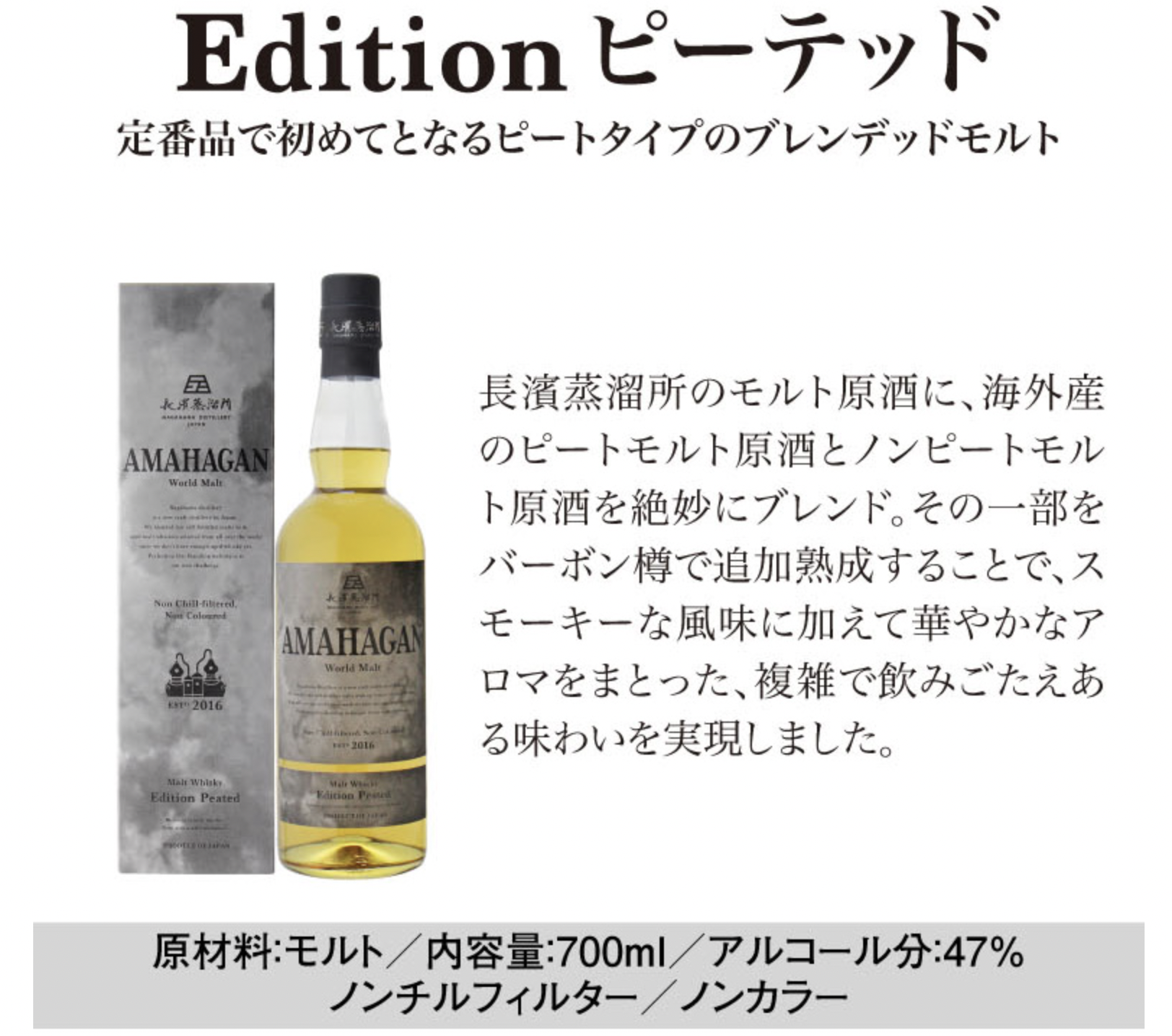 長濱蒸溜所を代表するウイスキーに「AMAHAGAN(アマハガン)」シリーズがあります。操業当時から様々なブレンディングを繰り返し、試行錯誤の末、2018年にシリーズ第1号となる「Edition No.1」をリリース。その後、同シリーズは、世界的なウイスキー品評会「World Whiskies Awards 2020」で、日本最高賞となる「Best Japanese Blended Malt」などを受賞しています。
