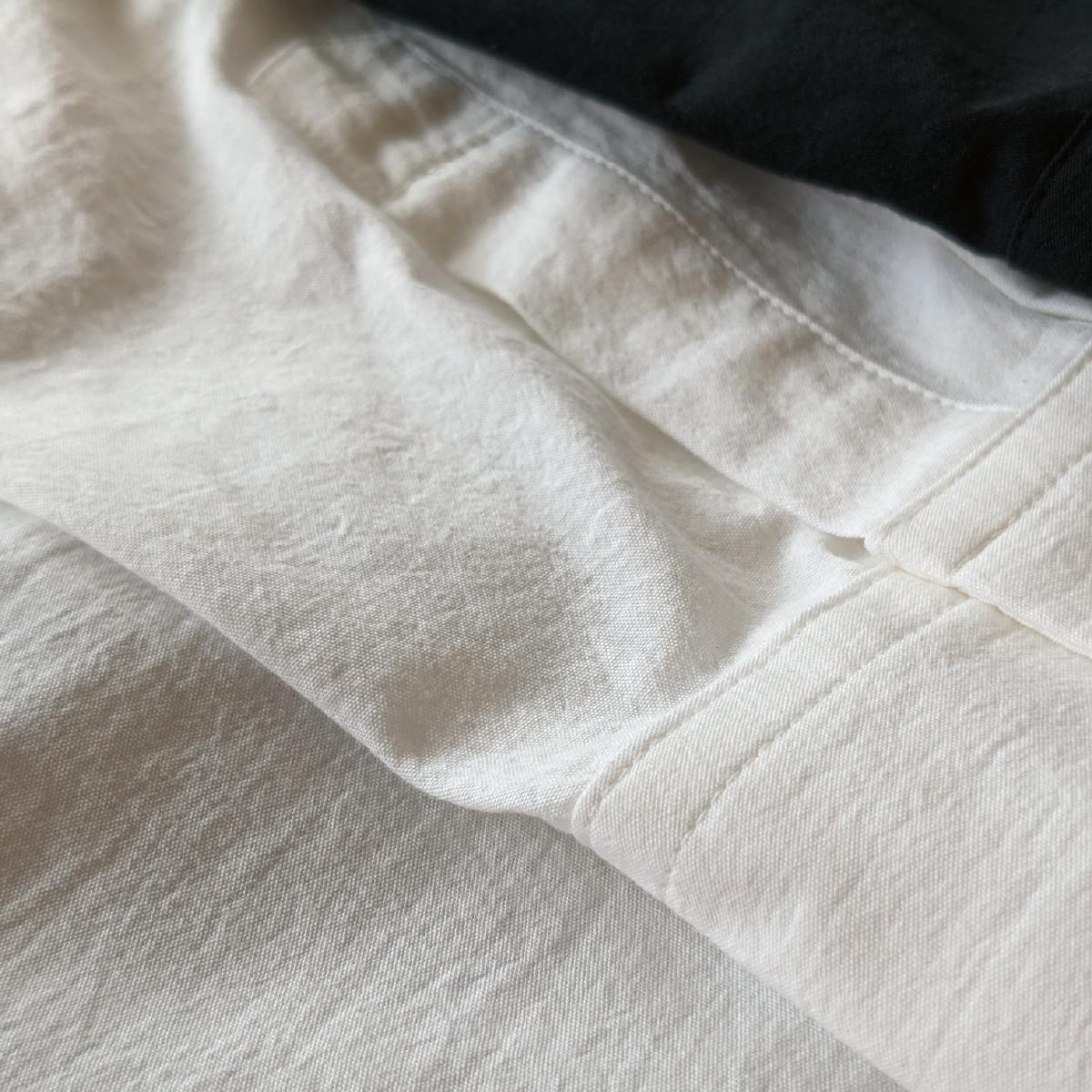 生地には強撚ドライワッシャーを使用しています。希少価値が高い、環境にやさしいオーガニックコットンの強撚糸です。少量ずつ丁寧に揉み洗いすることでナチュラルなシワ感とドライタッチで清涼感のある風合いとなります。