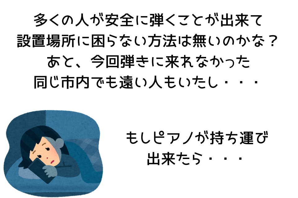 体の不自由な方や、慰問コンサートに行く施設の方は、介助無しでは駅前まで弾きにくることが出来ません。ただピアノを設置するだけでは、すべての方を笑顔にすることは難しいと考えました。