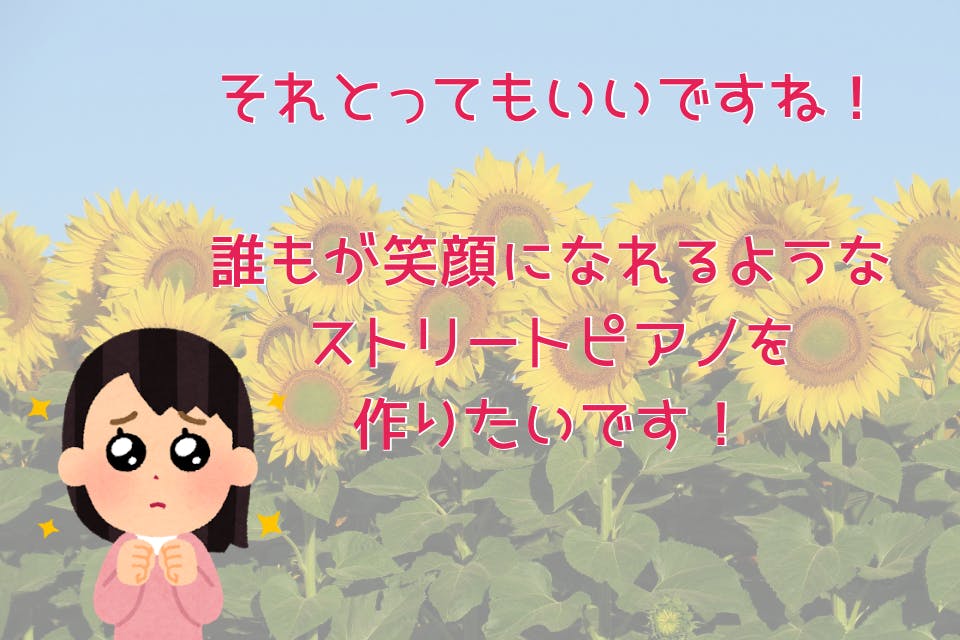 移動が出来るストリートピアノ「クルマdeピアノ」を制作し、ストリートピアノでつなぐ笑顔の和を広げたい。そして八街市をもっとたくさんの人に知ってもらいたい。