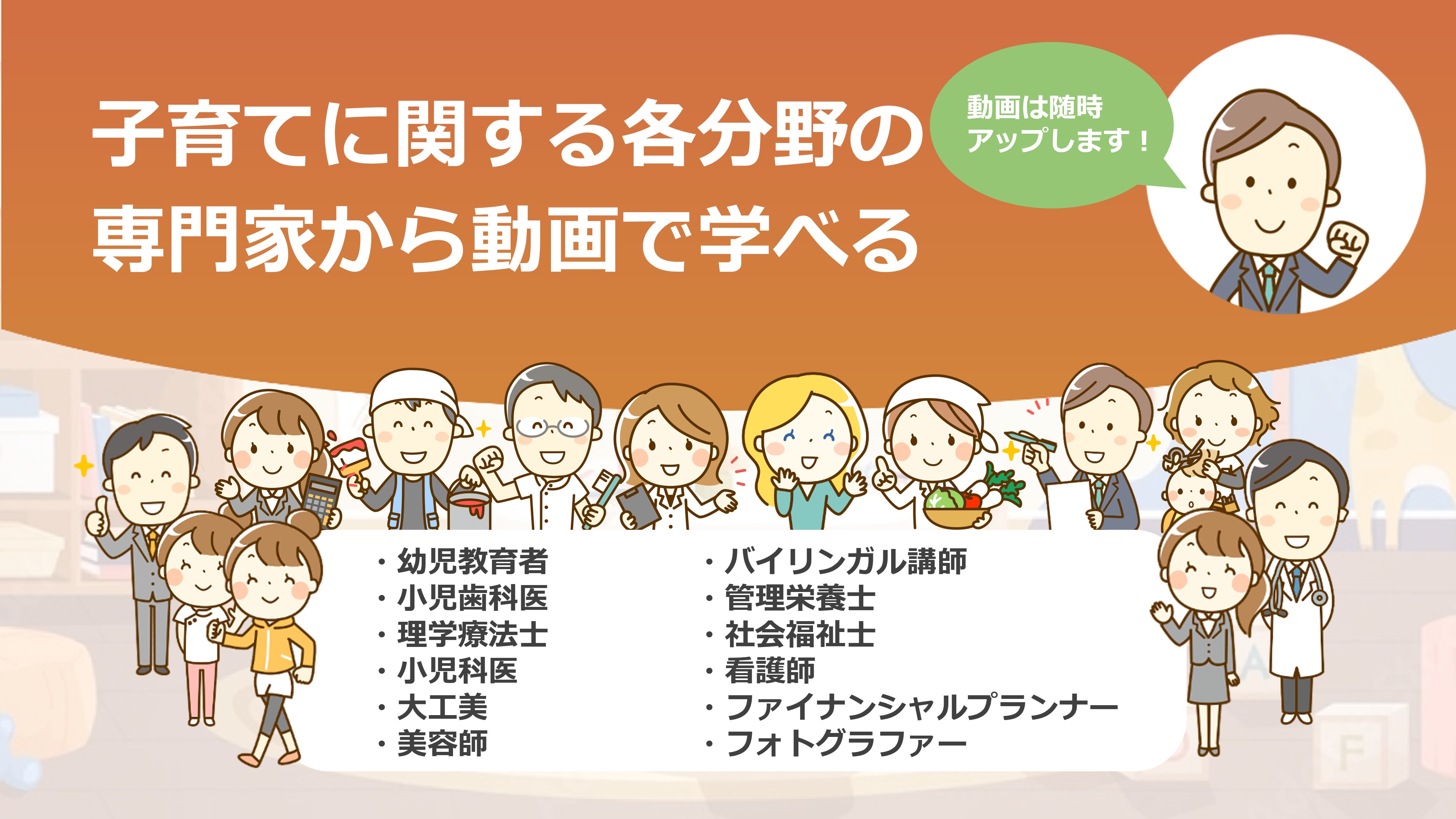 コンテンツとしては、家庭内教育、バイリンガル教育、お金の教育、性教育、子どもの健康・発達、食事や栄養など、子育てに関する様々なことです。専門家は、ただの講師やコンサルタントではなく、実践者のみで構成されています。