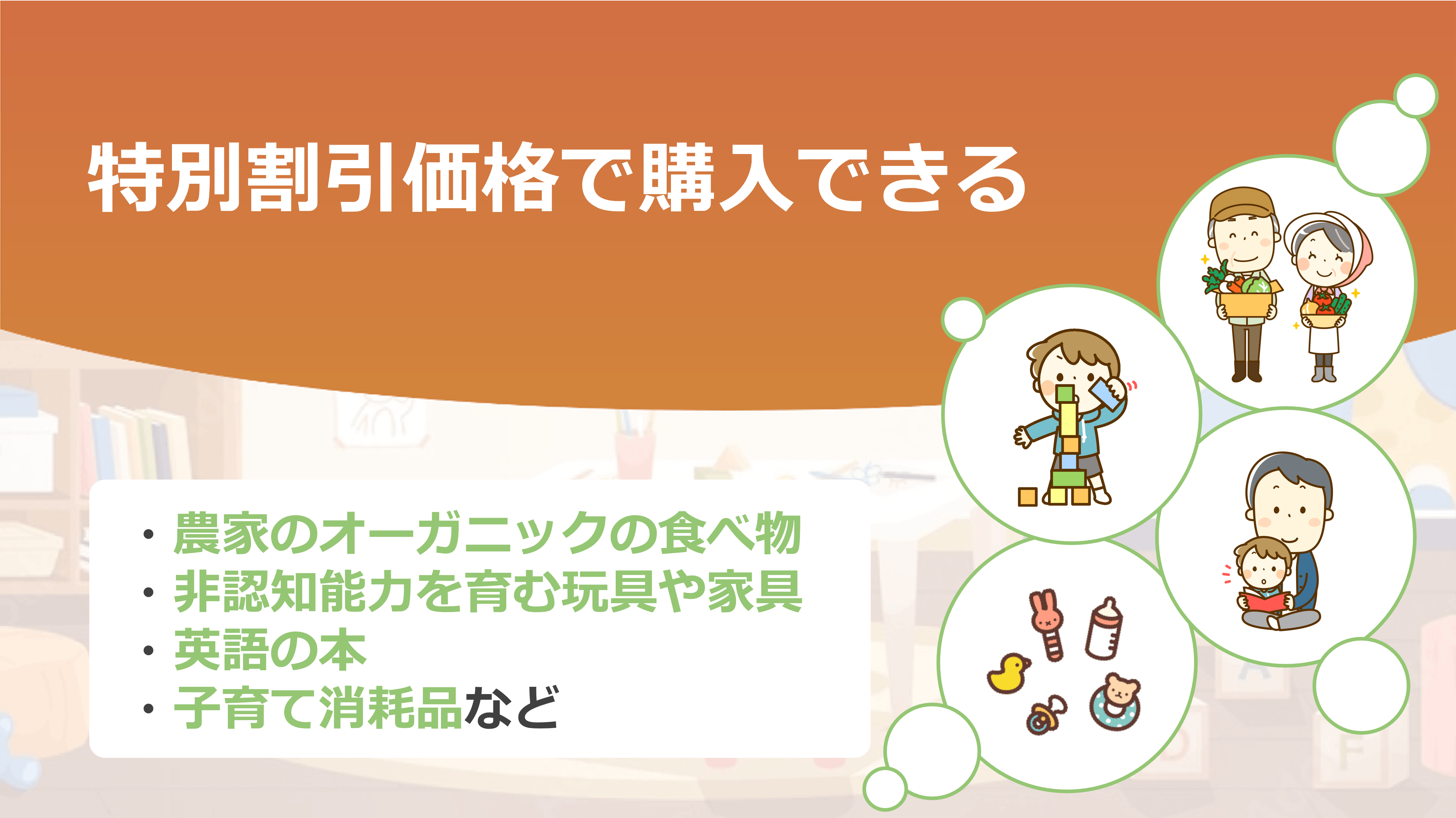 提携農家のオーガニック野菜や果物、知育玩具や海外のおもちゃ、英語の本や教材などをアプリ上で