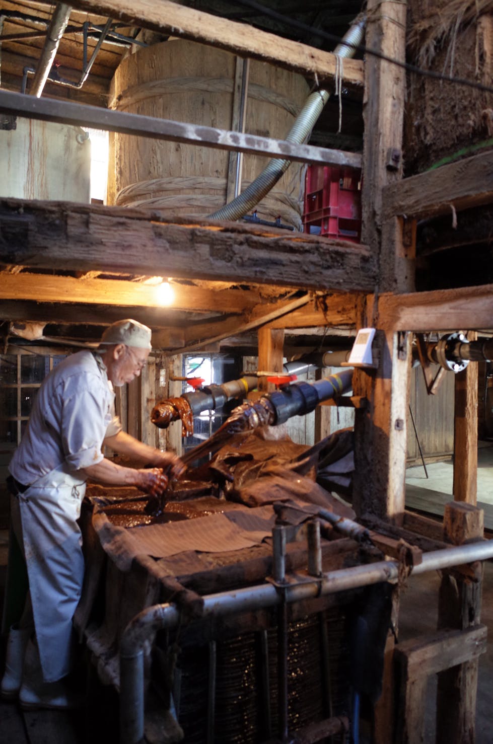 2021/12/09 20:38もろみの熟成が終わると、次は搾りの作業がはじまります。最初は、サラサラだったもろみは時間の経過とともに熟成し、ドロドロとした深い茶色に変化します。明治屋醤油では、蔵出しは3年。その他の醤油は1年半寝かせます。その間、微生物の力でジワリジワリと旨味を増して育っていきます。もろみが一時保存される大樽そして、このタイミングでまたホースが登場します。熟成を終えたもろみは、2階のもろみ部屋の入り口前に設置された大樽に移され、そこから、さらに1階のもろみを搾るための船と呼ばれる箱に移動します。2階から1階へホースを伝ってもろみが移動しますそして、麻袋の中にもろみを少しずつ入れて、重ねていきます。この作業を繰り返し、まずはもろみの重さだけで出てくる醤油をとり、それが落ち着いたら、その後機械で圧搾するそうです。もろみは、トロトロで水分が多いのでいきなり圧力を掛けても隙間から染み出してしまうのだそう。だから、この作業も何日か時間を掛けて、行うのです。麻袋の間から醤油が染み出してきますこうして搾った醤油は、そのまま生醤油として瓶詰めされるものと火入れして別れて商品として旅立ちます。この古い工場からどれだけの醤油が出荷されてきたのでしょう。明治屋醤油の美味しさは、この工場があってのものなのかもしれません。 もっと見る