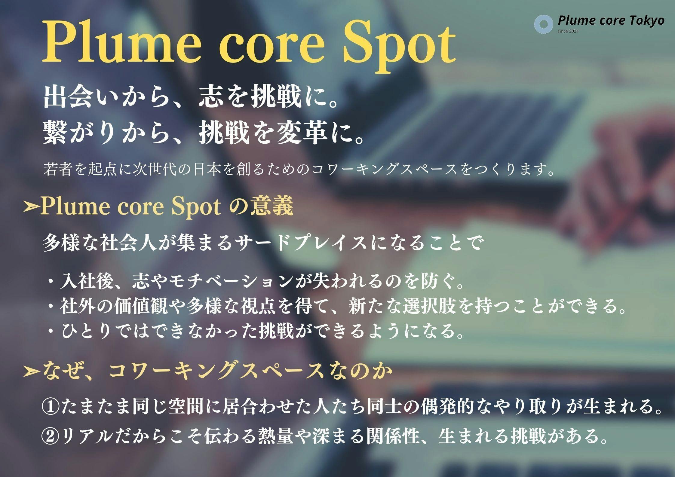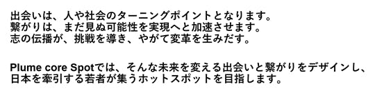 「Plume core Spot」は、そんな未来を変える出会いと繋がりをデザインし、日本を牽引する若者が集うホットスポットになります。