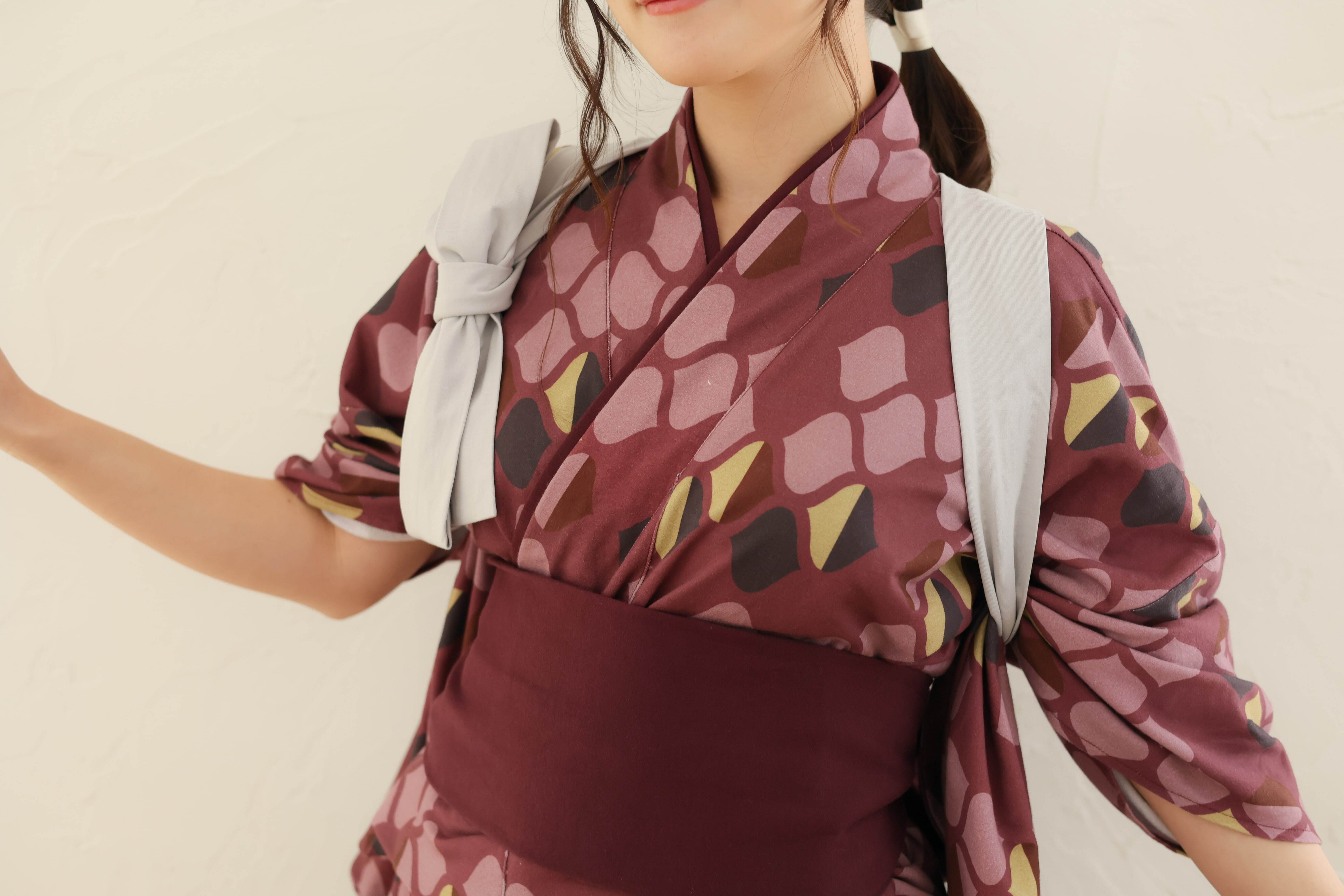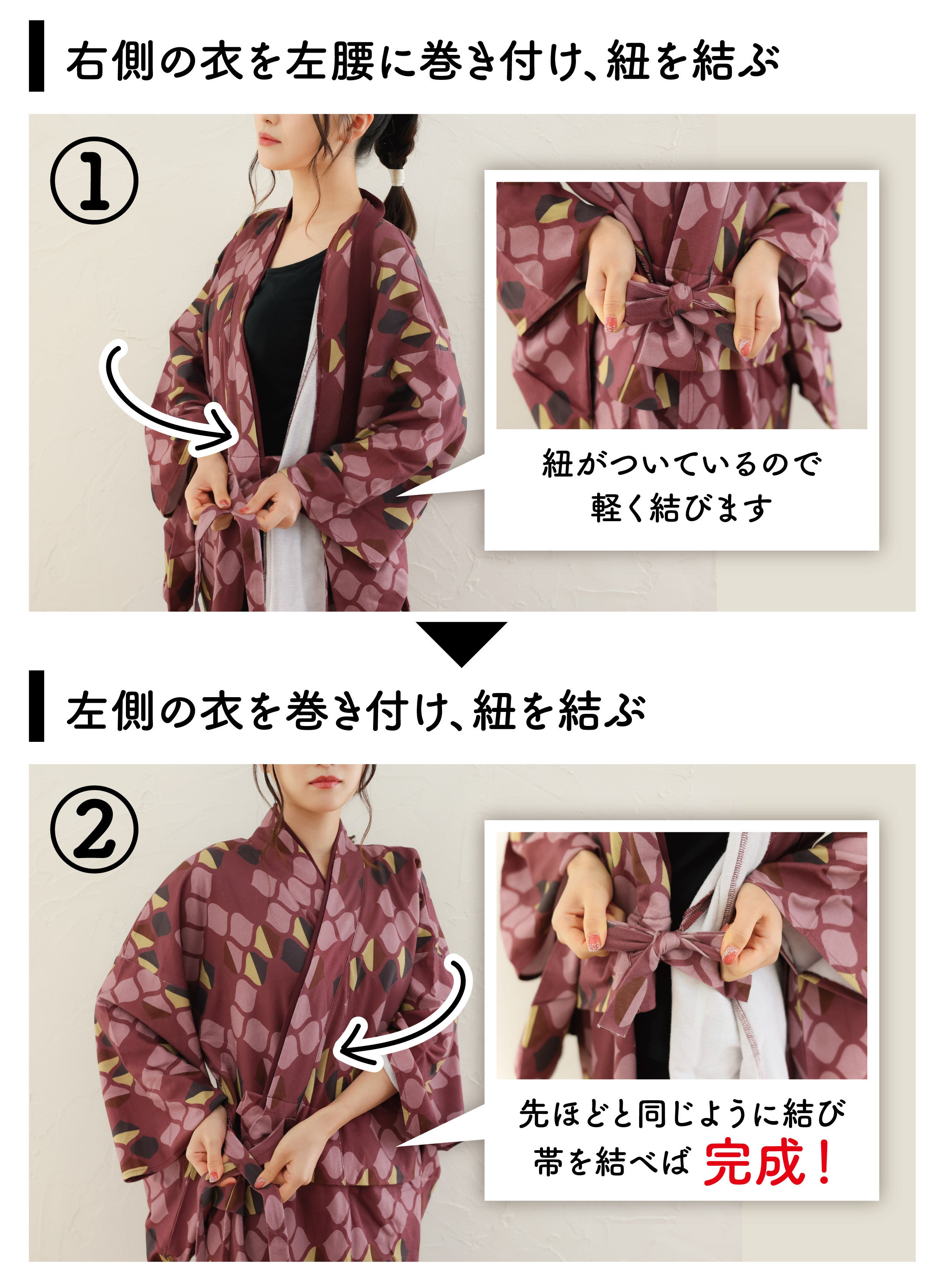 2021年3月にリリースした第一弾の「ゆる着物 令和版」では作り帯&マジックテープで留める仕様でしたが、より簡単に楽しんでいただきたいという想いから、今回は館内着のような仕様を採用いたしました!どなたでも迷いなくご着用いただけます。