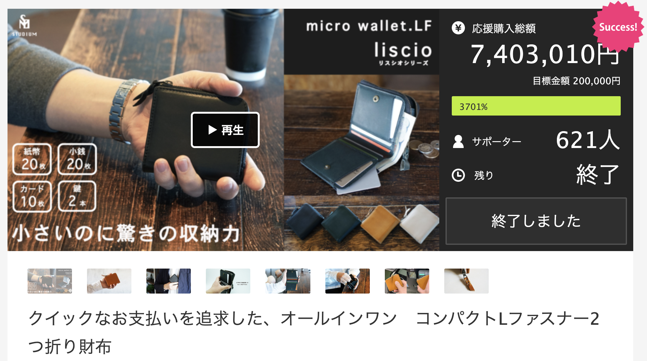 [マイクロウォレットLFリスシオ] イタリアンレザー「エルバマット」バージョンは、クラウドファンディングサイトMakuake(マクアケ)にてご支援者様621人、目標金額3701%(740万円)達成!たくさんのご支援頂きまして、誠にありがとうございます。