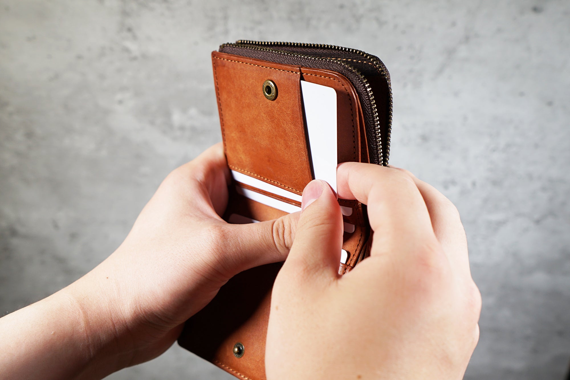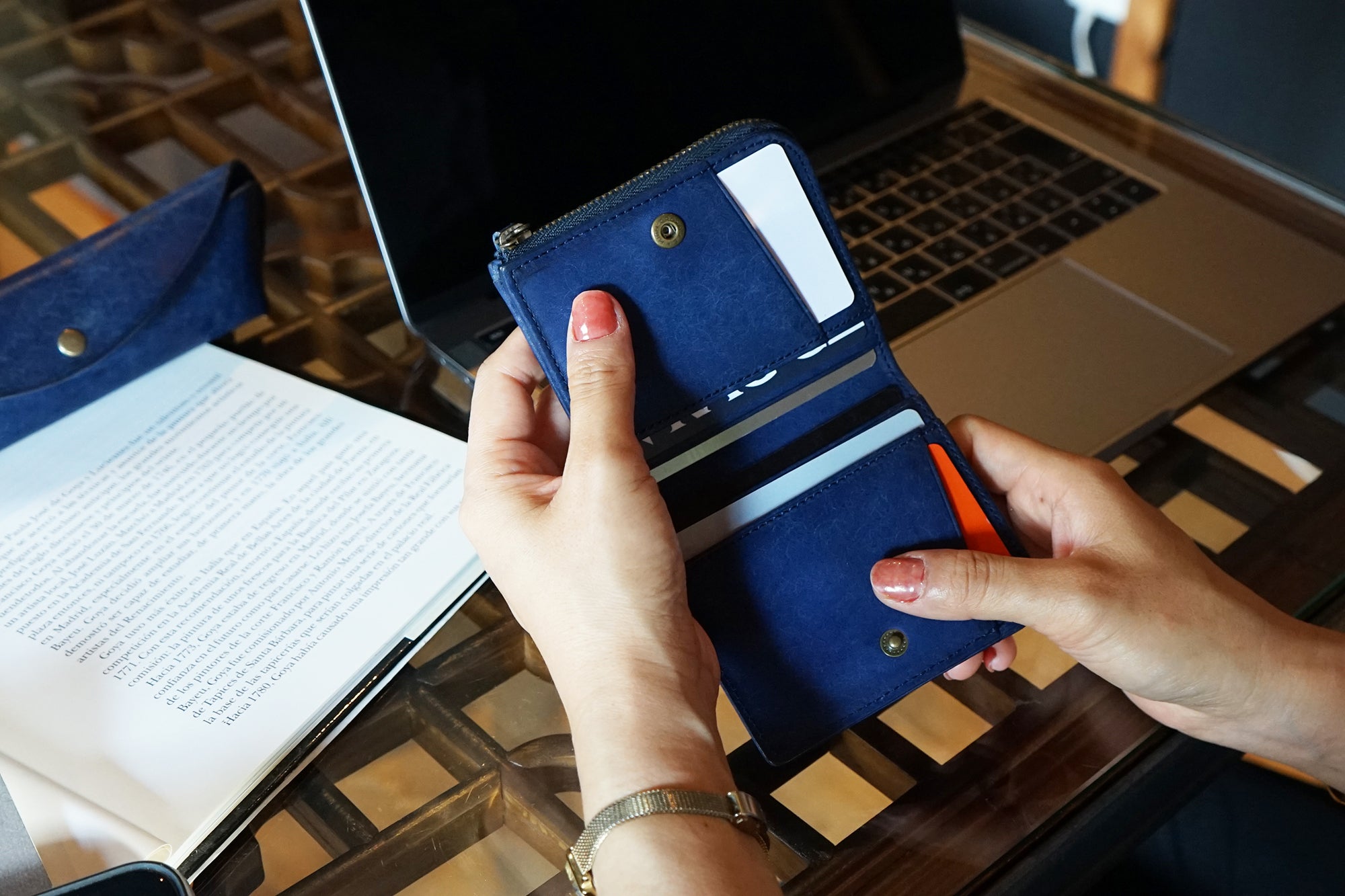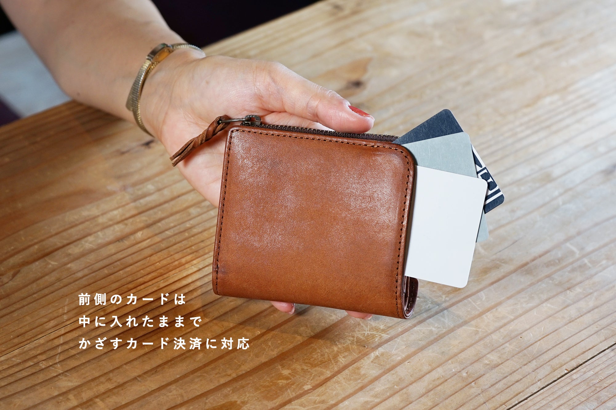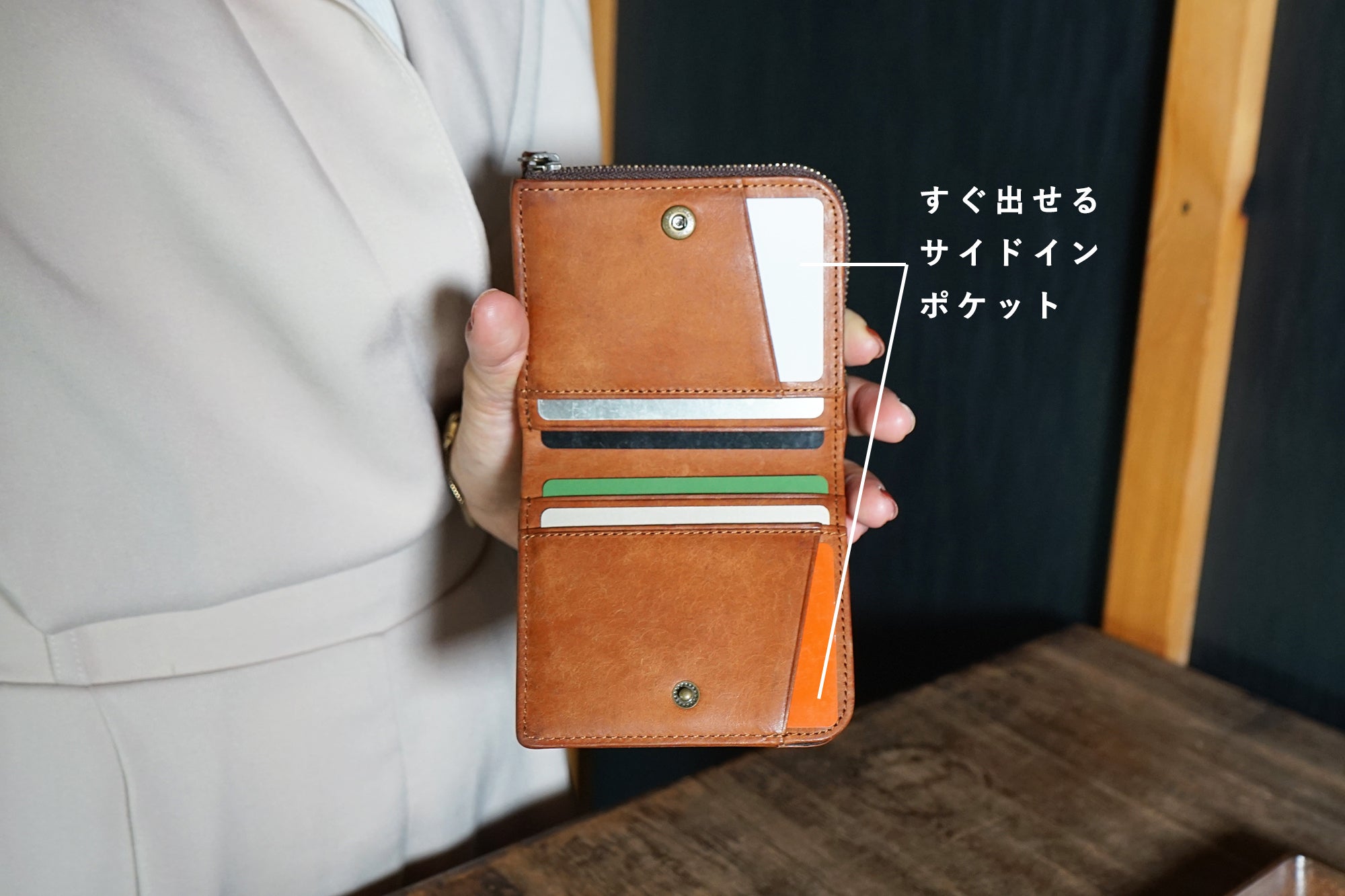 財布を開くことなく、瞬時にカードを出し入れ可能で、カード決済端末の差込式やスライドタイプに対応します。3枚ほど収納可能で、それぞれずらしてカードをすぐに認識。