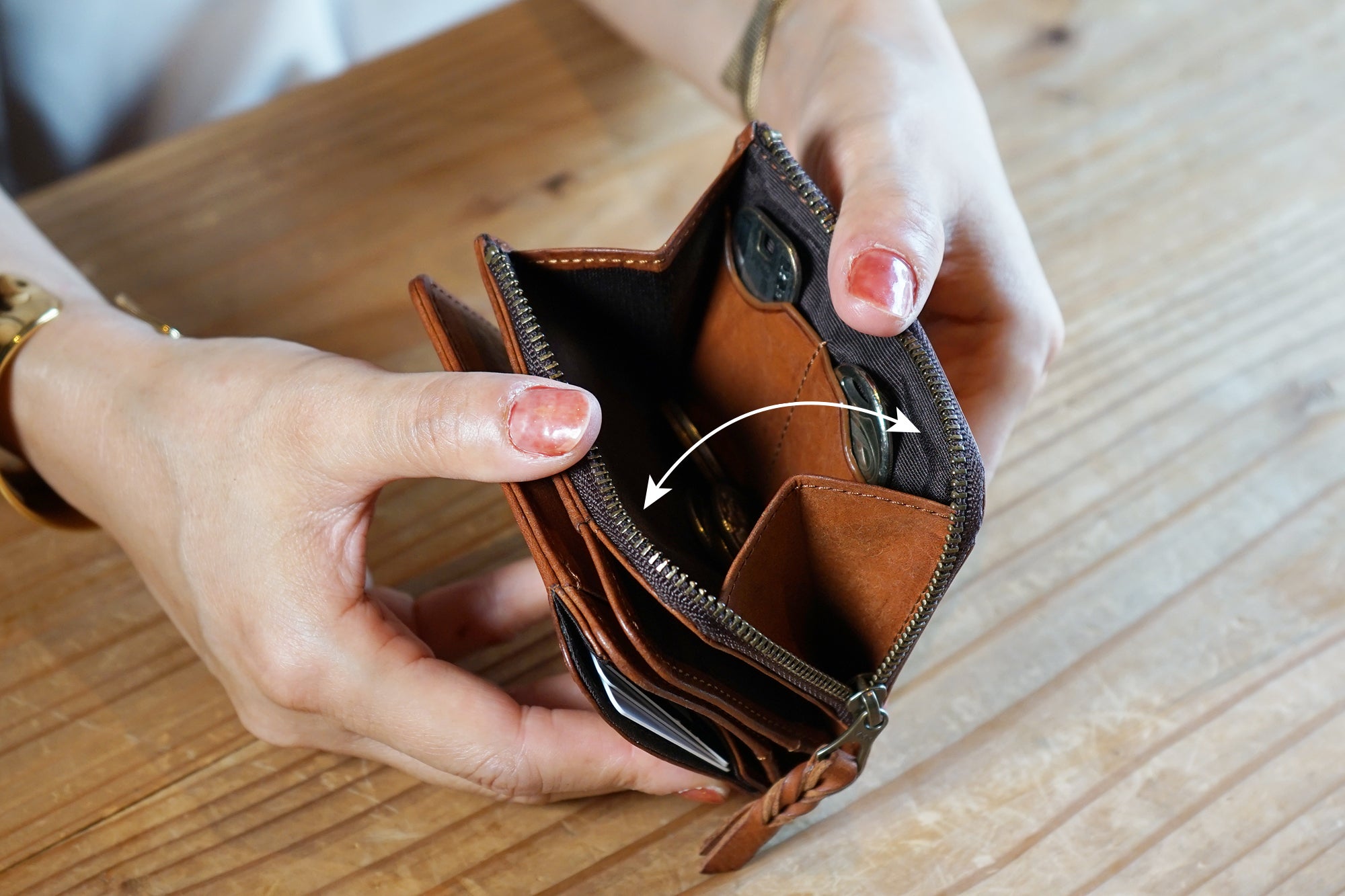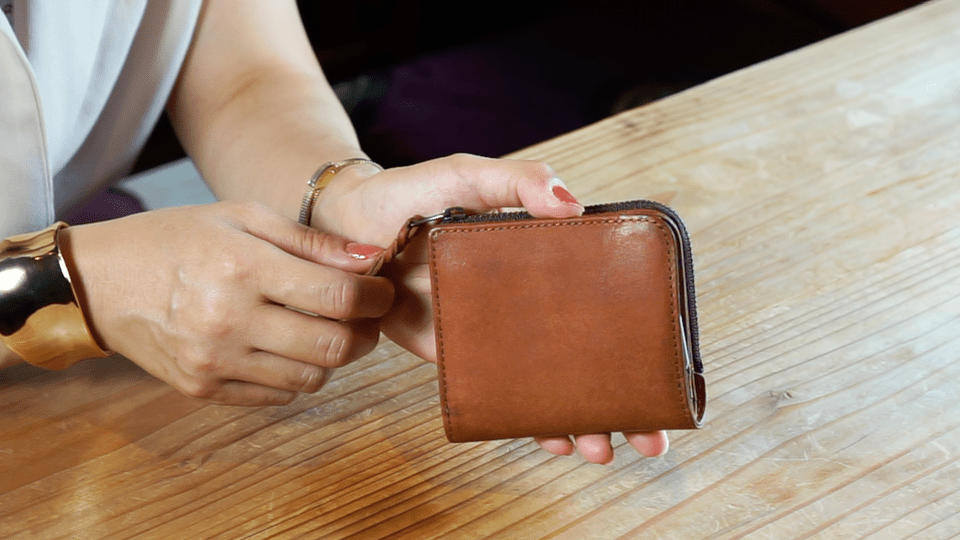 今、薄い財布が多く出ていますが、コインスペースとカードスペースをずらして薄くしています。そうすると、タテに長くなり、握ることはできません。さらに小銭入れはとても小さく、急いでいたり意識していないと、こぼれてしまいます。