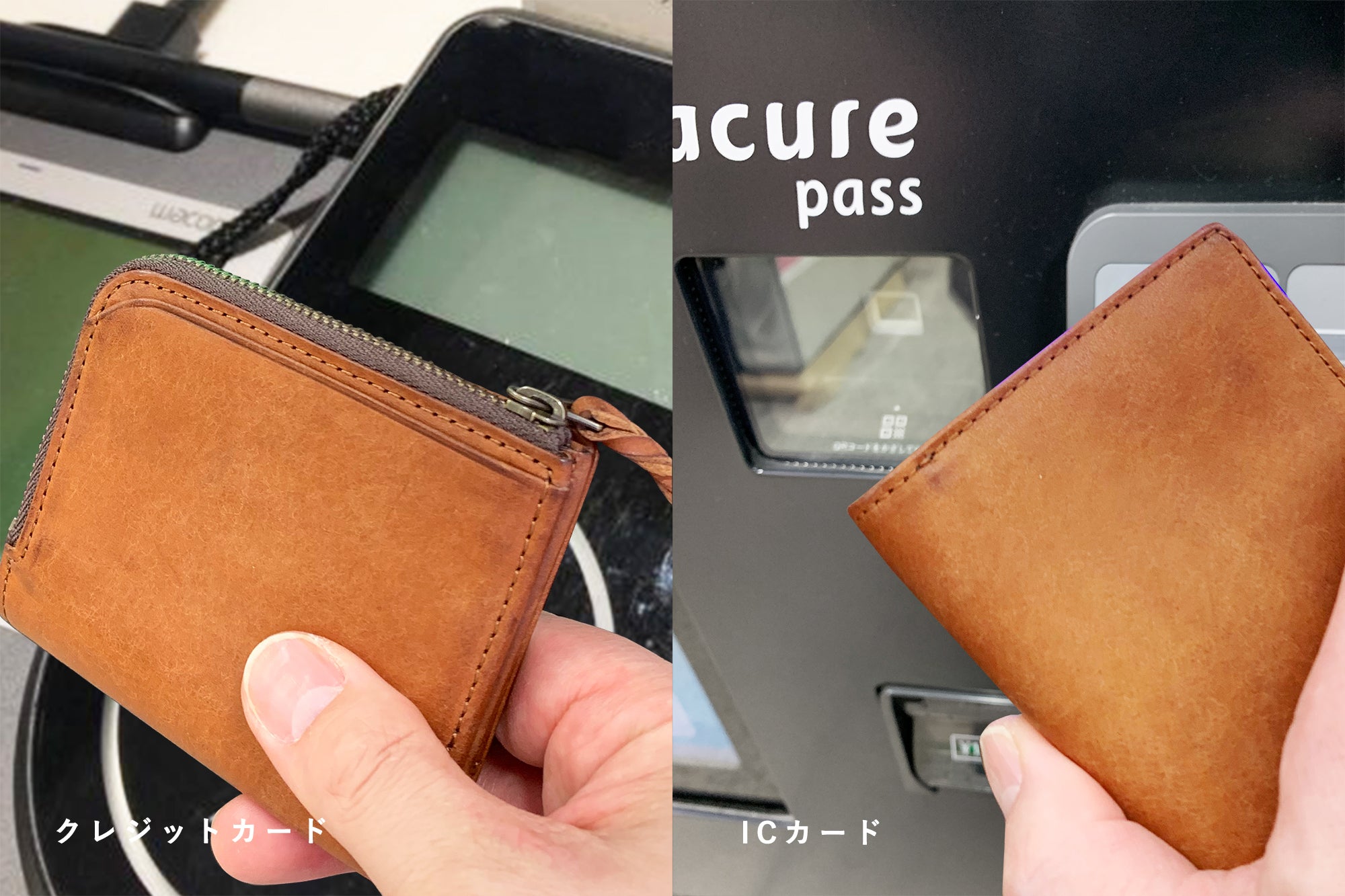 クレジットカードとICカード・IDカードとICカードなど、2種類の異なったカードを入れたまま、それぞれピッとかざすだけ。