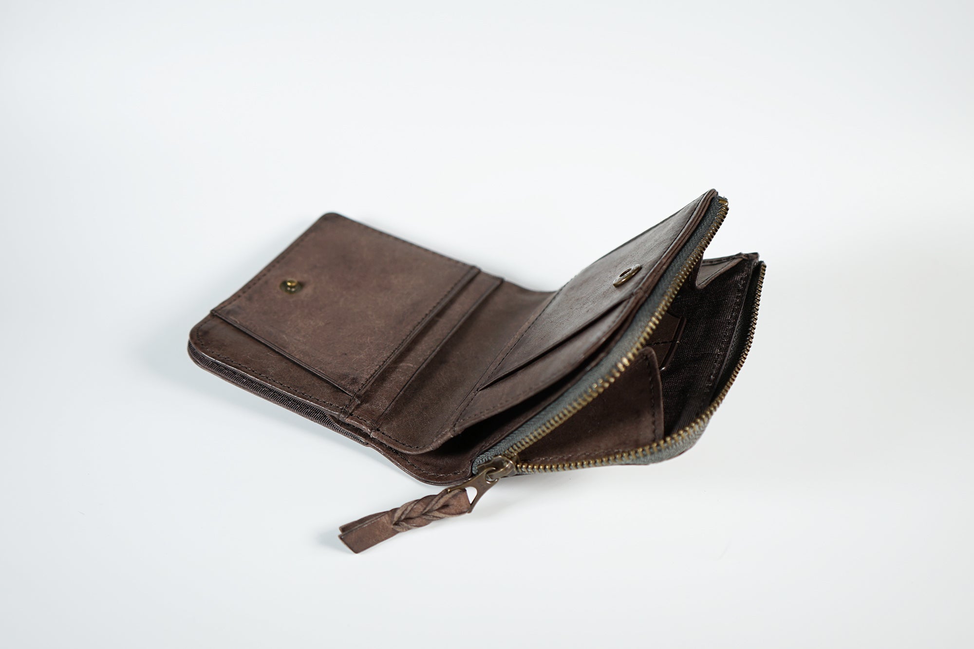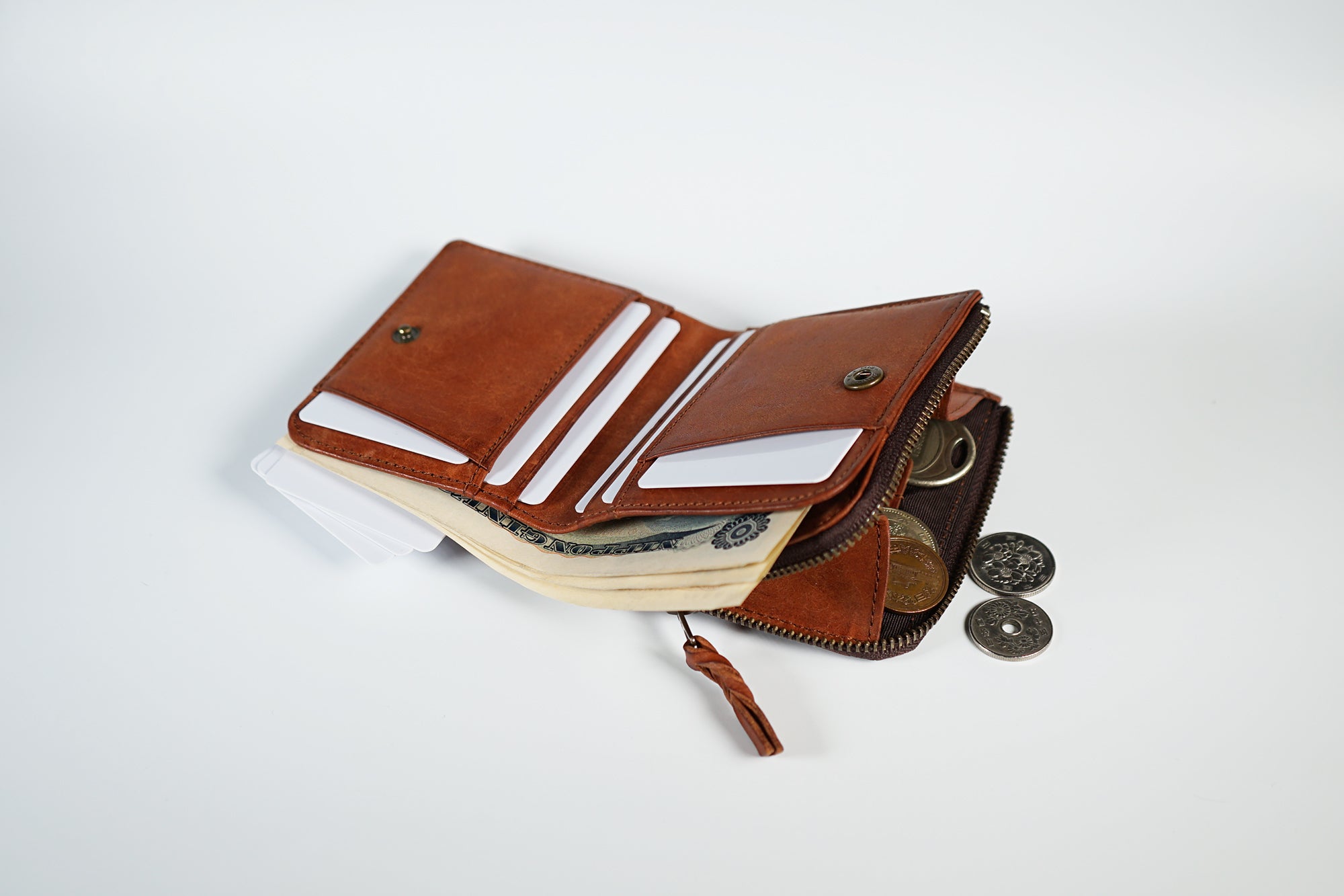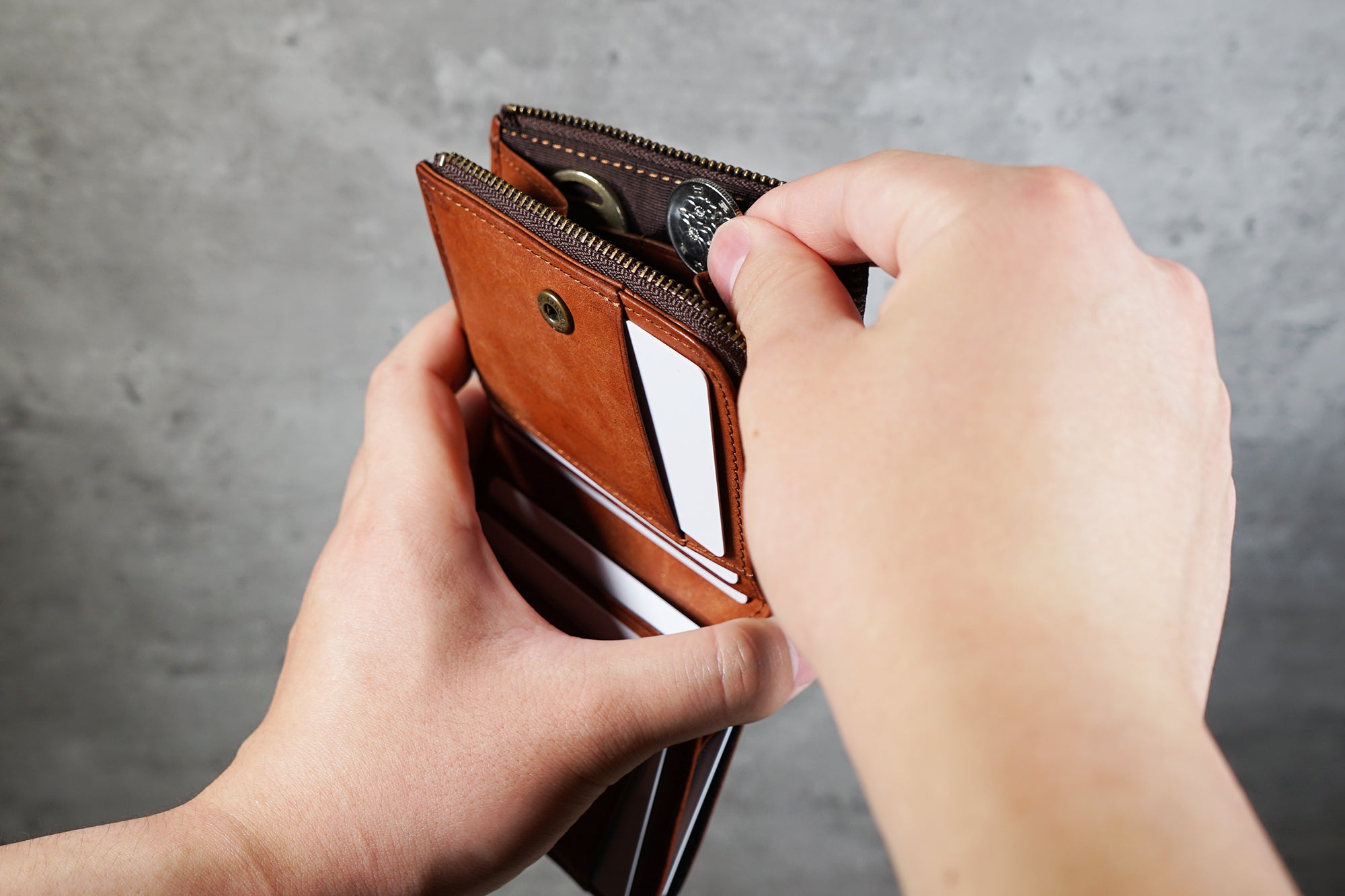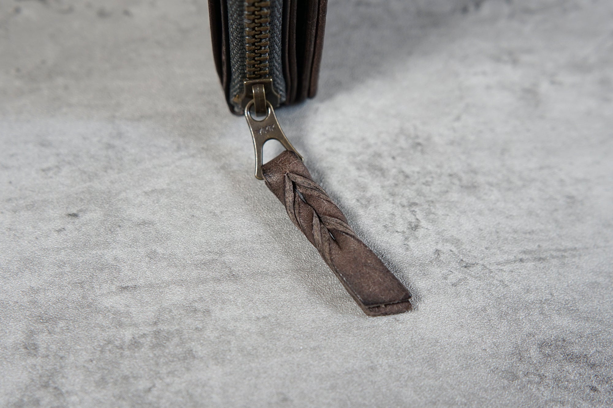 ファスナーは信頼のYKK社製。 まさにひとひねり加えた革引き手は、革製品らしい大人の遊び心を表現しました。