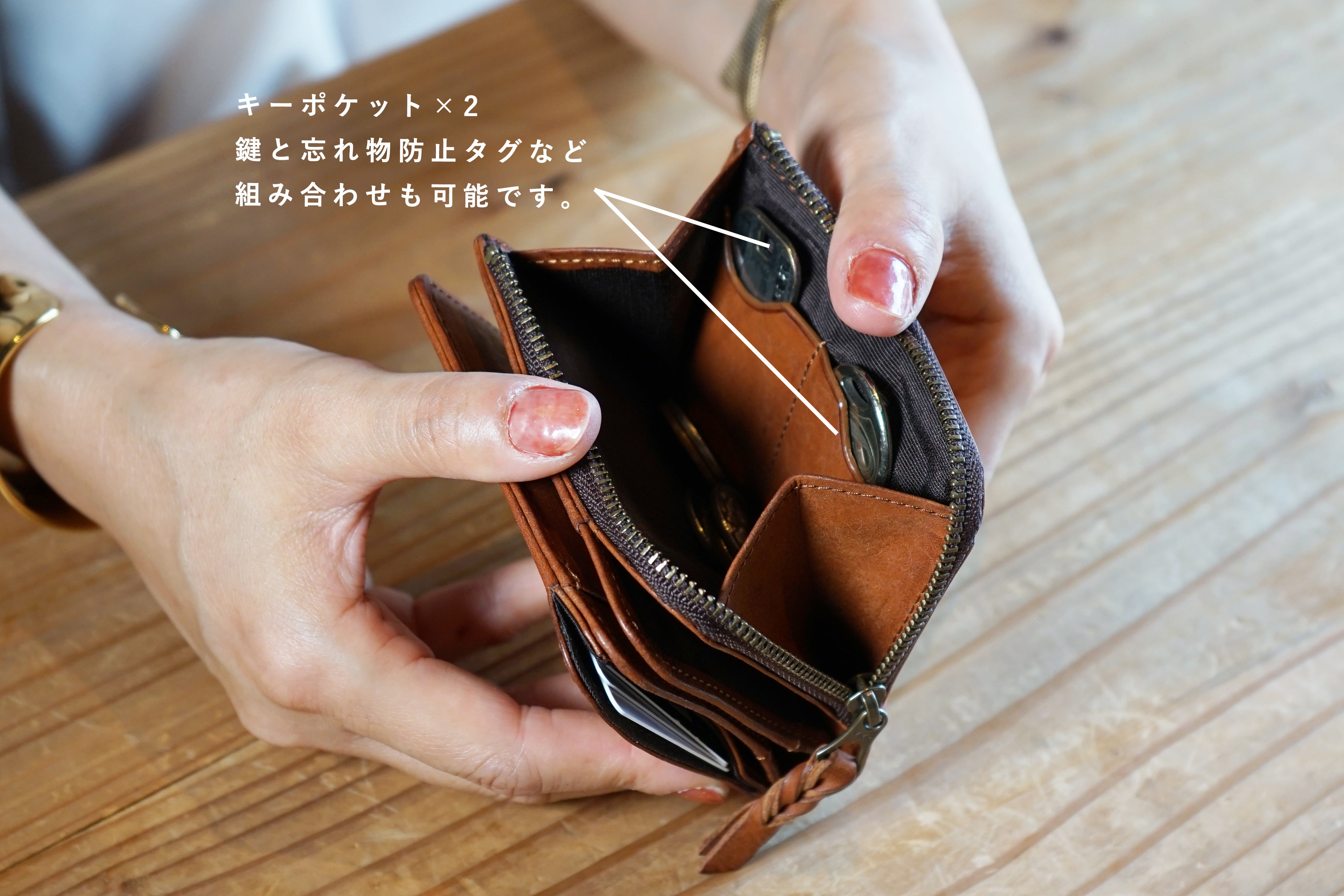 ラウンドファスナータイプよりも素早く開けることができるLファスナータイプ。小銭・鍵の指定席で、財布を閉じた状態でもファスナーを開くだけで小銭を取り出せます。カバっと大きく開き、中身が見やすく、取り出しやすい!鍵専用のポケットが2つあり、ファスナーを開けるだけですぐ取り出せます。
