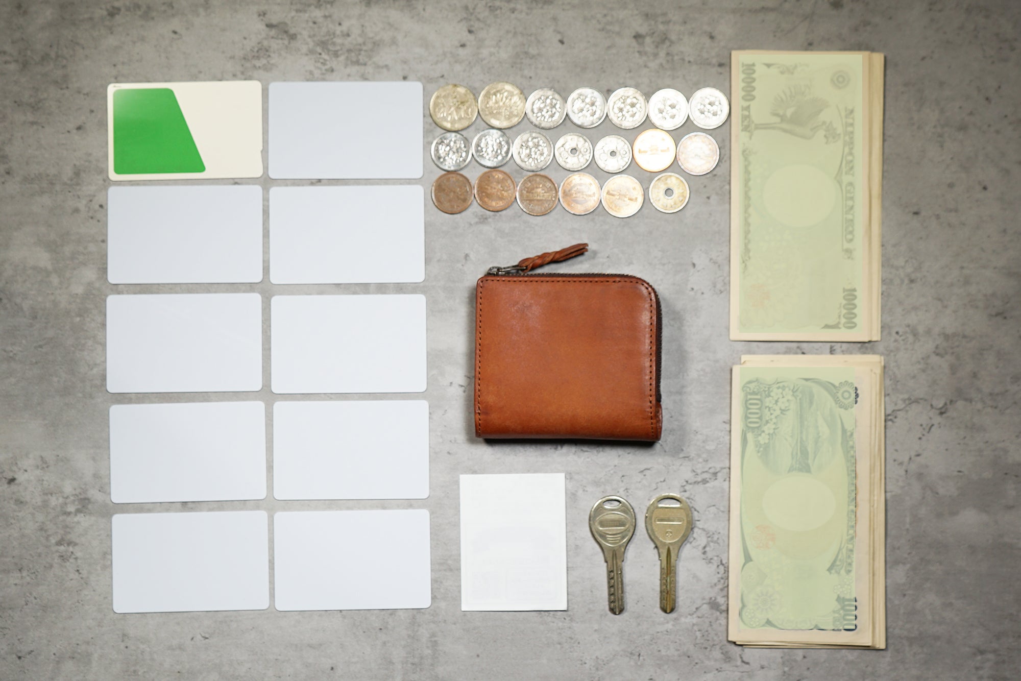 小銭20枚ほど、紙幣20枚ほど、カード10枚ほど。さらに鍵を2本やレシート等収納可能。コンパクトの中でも収納力を確保しました!